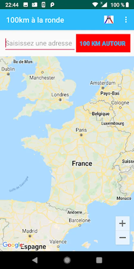 Application Friend-IA 100km around allows you to draw a circle with a radius of 100 km from the address entered.