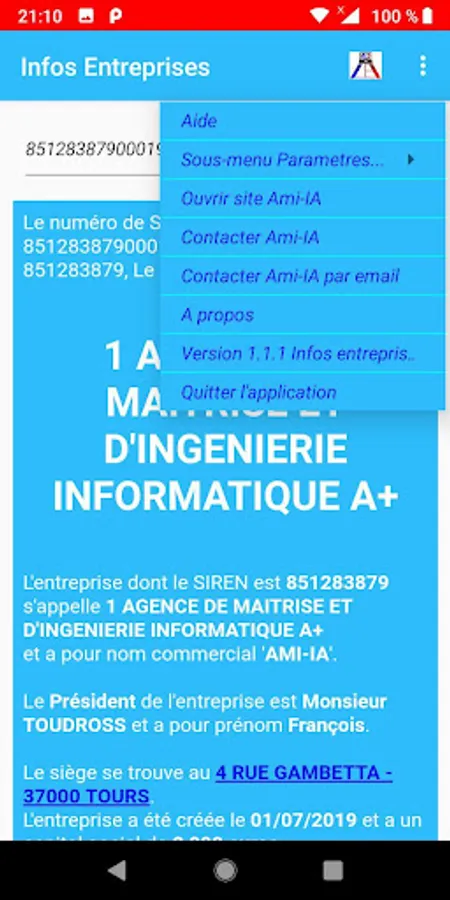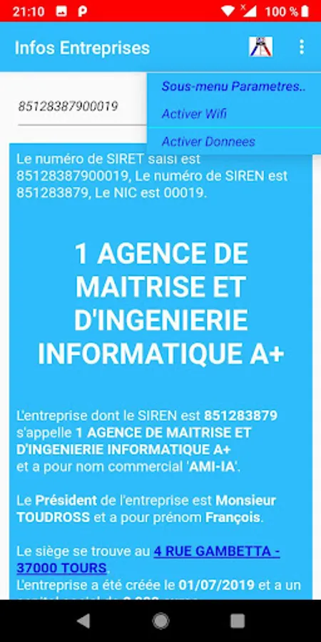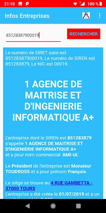 Friend-IA application allowing to find the information of a company from SIRET or SIREN