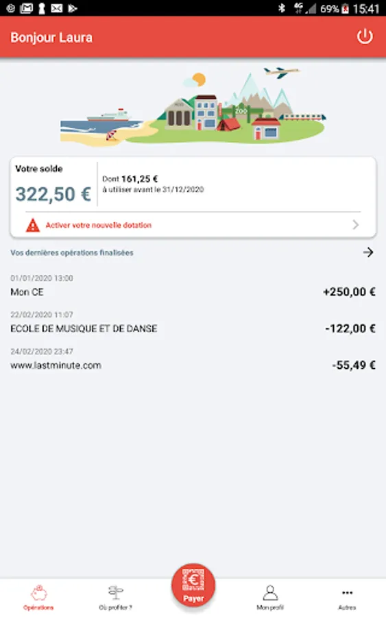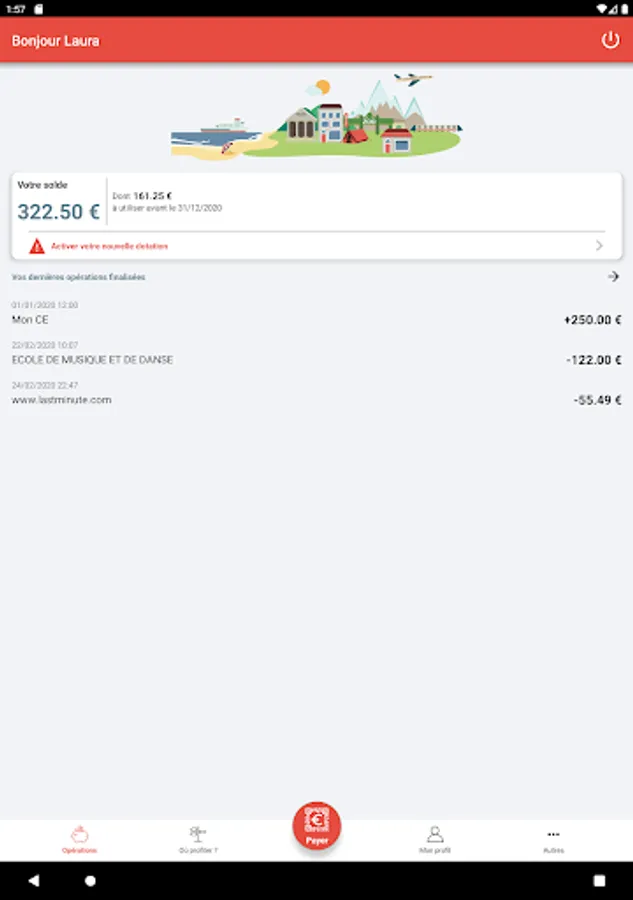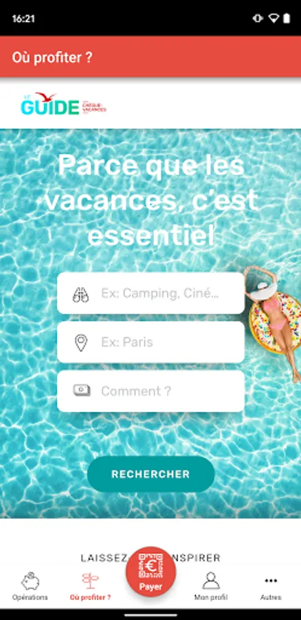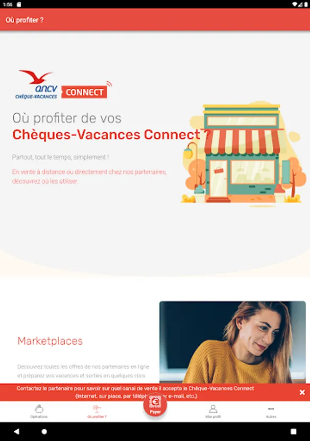 The Chèque-Vacances application allows you to pay at your merchants and e-merchants in the Chèque-Vacances network fully dematerialized, to the nearest cent and from € 20 of purchase.