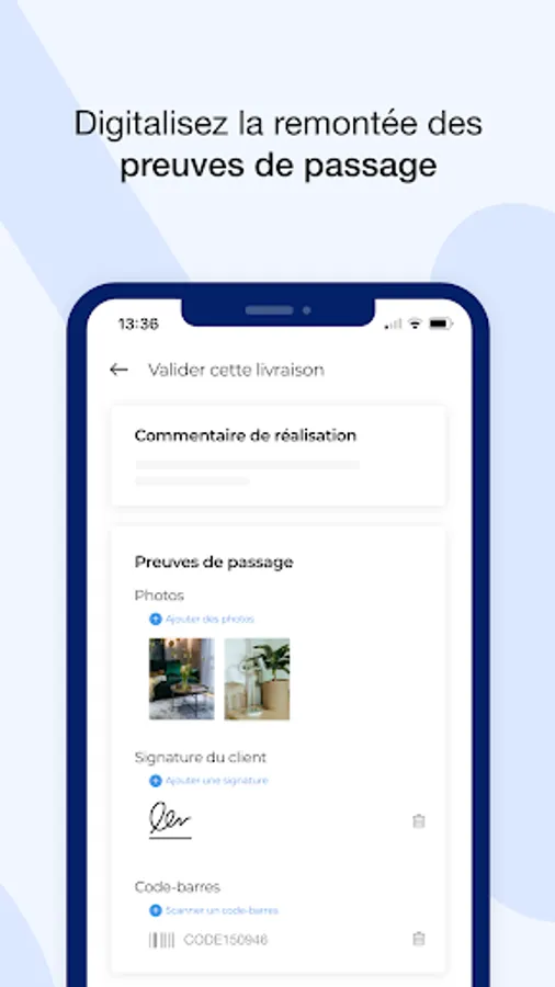 • The automated feedback to the operations manager of the proof of delivery (comments, photos, barcode and signature of the customer);