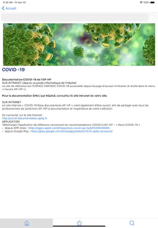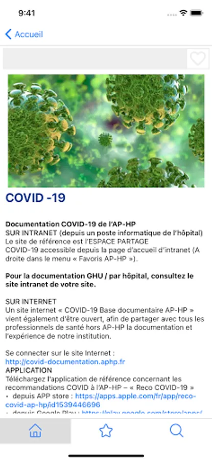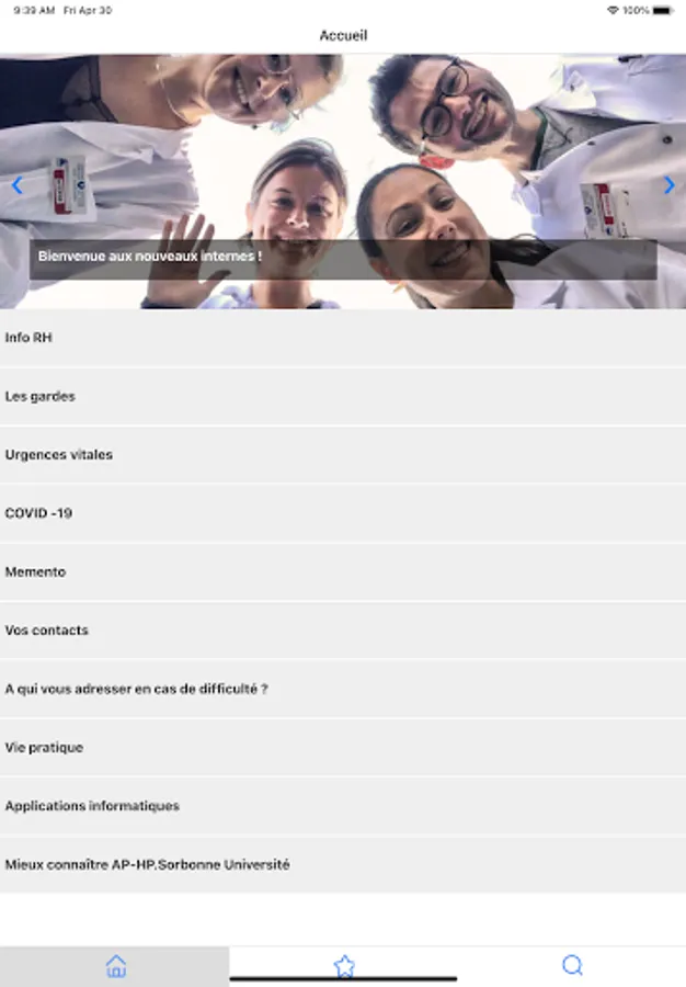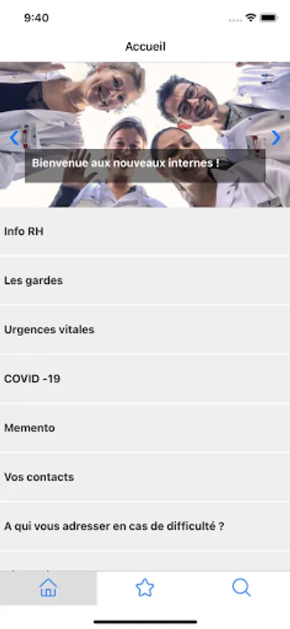 This application contains the reception information, the directory and the most frequently used protocols. In the long term, it will make it possible to replace paper documents that are often incomplete and quickly obsolete, in particular intended for new arrivals and more particularly the youngest (interns) who change hospital internship every 6 months. The content of this application will be regularly updated and enriched with new treatment protocols validated by the medical community of our hospital group. We want to make it a practical and indispensable tool. This project is part of the APHP's desire to build tools using modern and essential means of communication, which are applications that can be used via Smartphones.