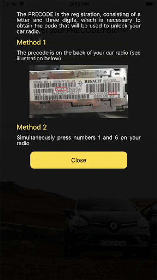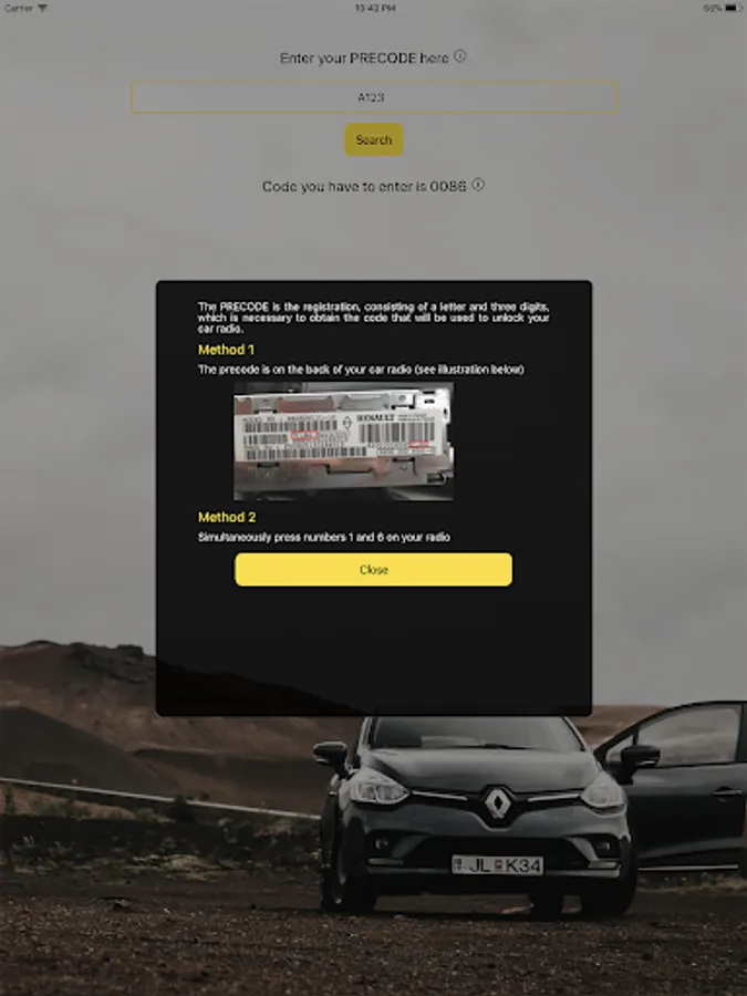 A simple and effective interface: simply enter the precode on the back of your car radio to get the activation code.