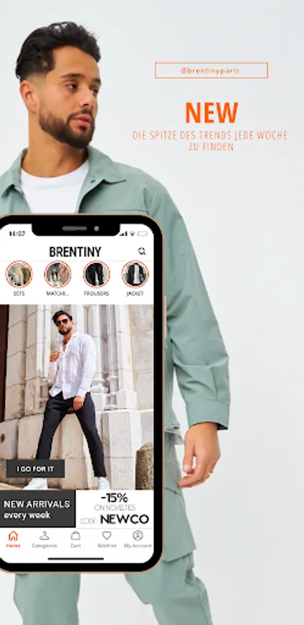 t-shirts, trainers, shoes, jogging suits, caps, hats, shirts, polo shirts, shorts and playsuits on the Brentiny Paris app.