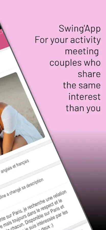 Swing'App is a mobile application for the swingers and libertine community exclusively, for those who want to meet people who share the swingerlifestyle, to find a swingerclub, to find open minded people who want to have threesome, foursome and more.