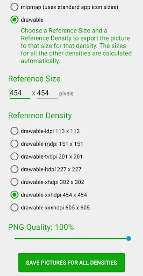 Dpi Resizer is a tool for all Android developers who want to convert easily picture resources (PNG or JPG) to all densities (from ldpi to xxxhdpi).