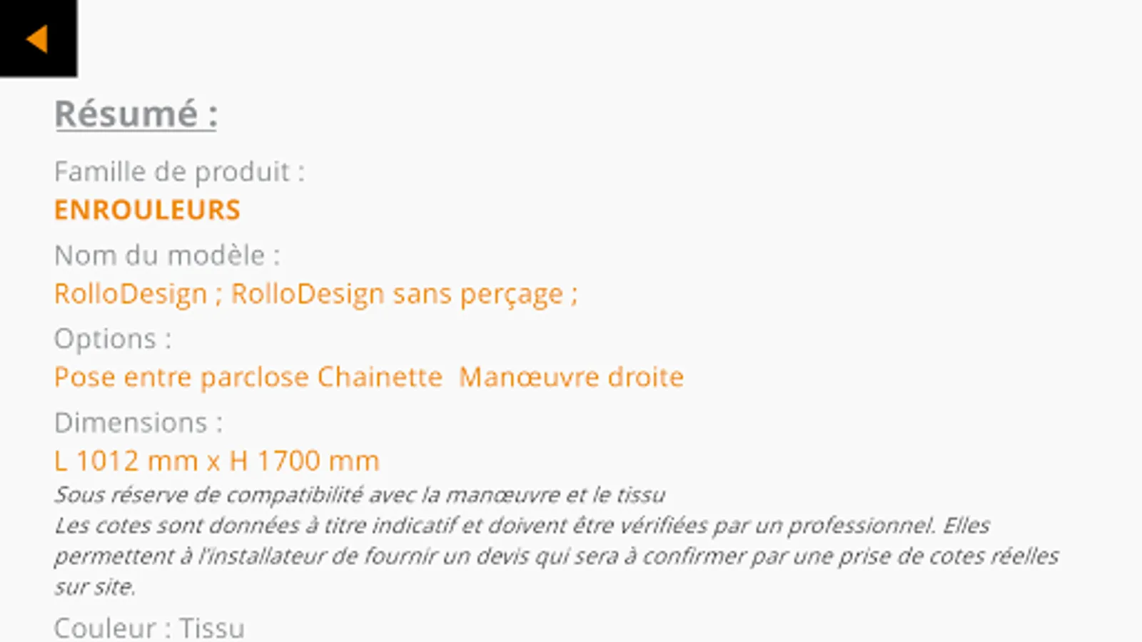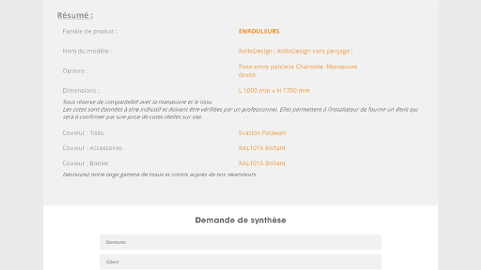 Once the product has been configured, obtain a PDF summary of your simulation, and contact details for resellers near you. They will take care of coming to take the measurements and give life to your project.