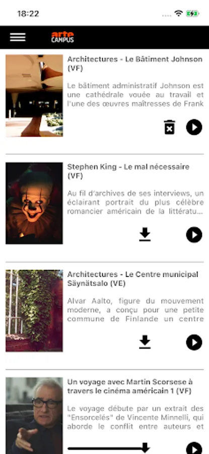 This application is intended for users of ARTE Campus. It allows them to view the videos previously selected on the site. Videos can be viewed in streaming or downloaded to allow viewing in offline mode, without an Internet connection. The videos are available in French versions and, for part of the catalog, in German, English, Italian and Spanish versions, as well as with deaf and hearing-impaired subtitles.