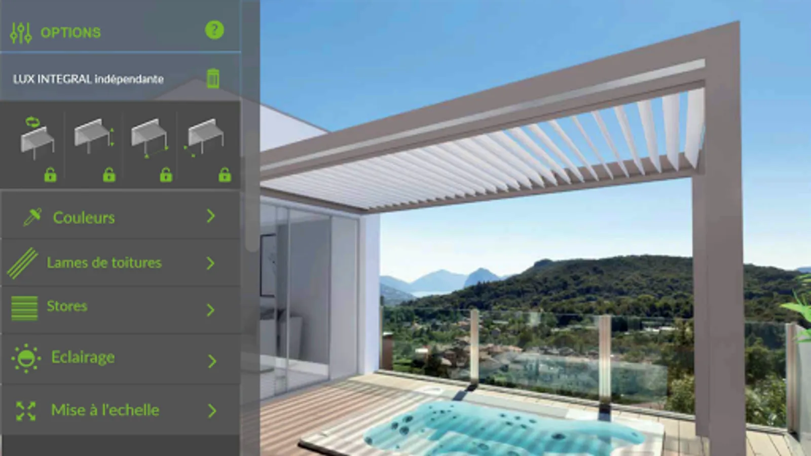 This innovative tool makes it possible to perform integration simulations in augmented reality of bioclimatic pergolas. A wide range of models Design or more classic associated with a large number of options will allow you to integrate your pergola to your home and visualize as if the pergola was already in place. Among the many options you will find; blinds, lighting with the day / night mode, the "stainless steel effect" strip and the opening of the blades. A palette of more than 300 colors will finalize your project that can be photographed and saved in the image gallery. True 3D simulator increased, it allows to open and close the blades of the roof, the blinds. You can move around your project without it moving and thus have a real rendering of your pergola in the existing environment.