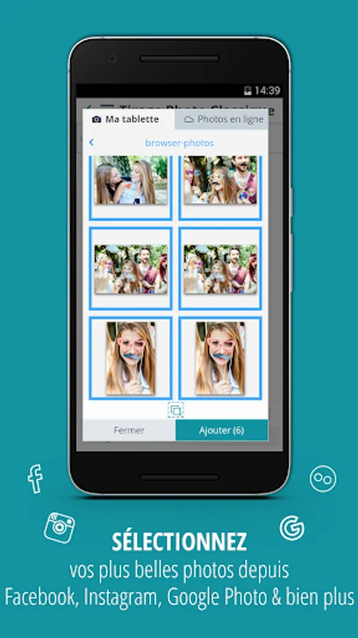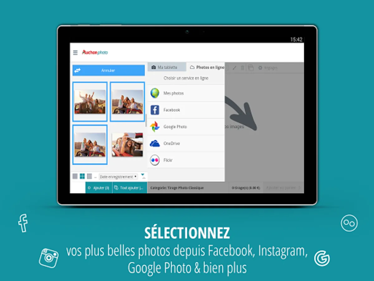 - Use photos from your Auchan Photo account, your smartphone, Facebook, Picassa, Google+, OneDrive or Flickr