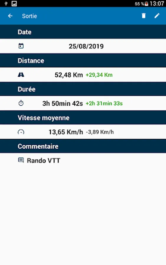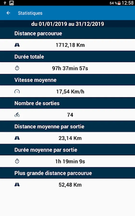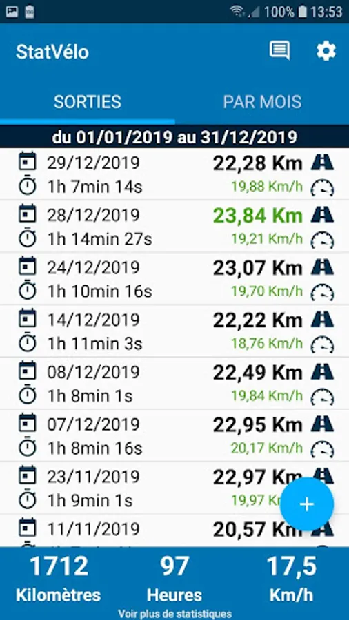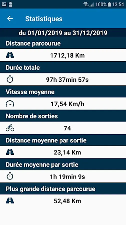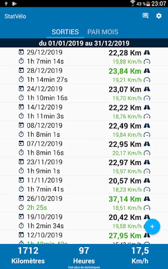 The application is organized in two tabs. The first tab displays all the outputs with some statistics at the bottom: total duration, distance traveled, average speed. It is possible to filter this list to display only the outputs of a desired period of time.