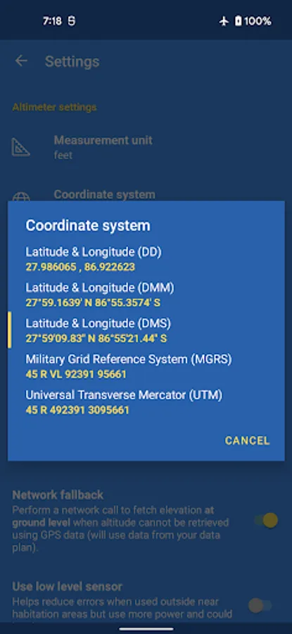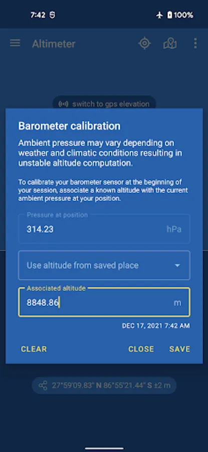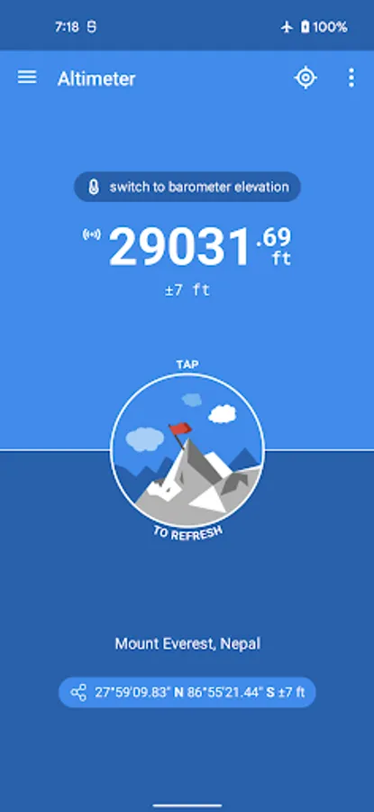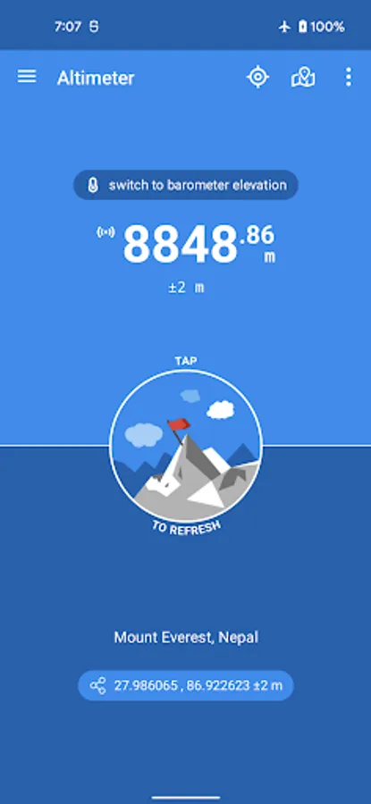 Altimeter is an handy Android application allowing you to get the true altitude above sea level (MSL) at your current location or any location on earth. It requires access to your device location to get raw altitude from the GPS signal and do not require a network connection to work. True altitude above mean sea level is determined using EGM96 Earth Gravitational Model. Main features are :