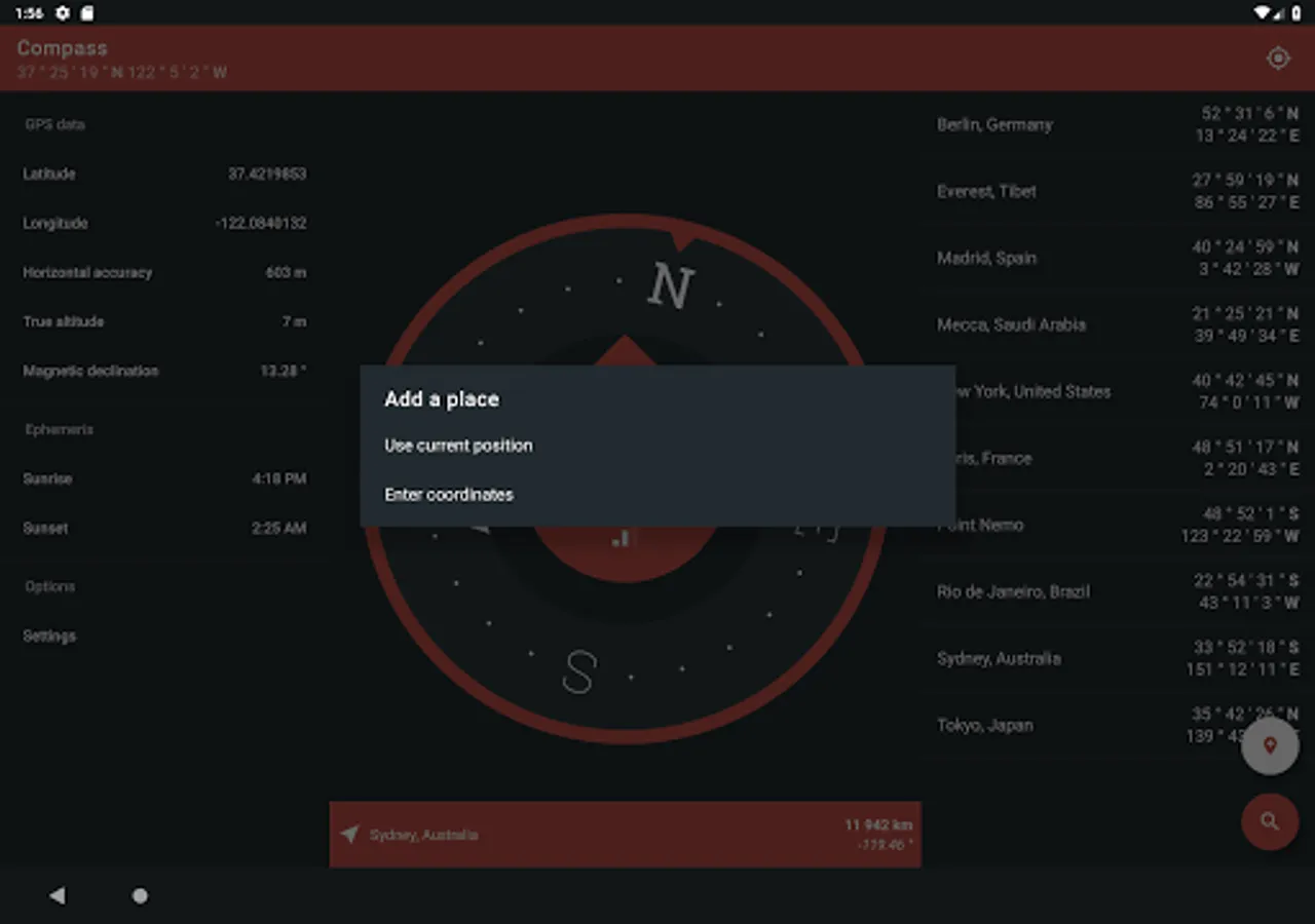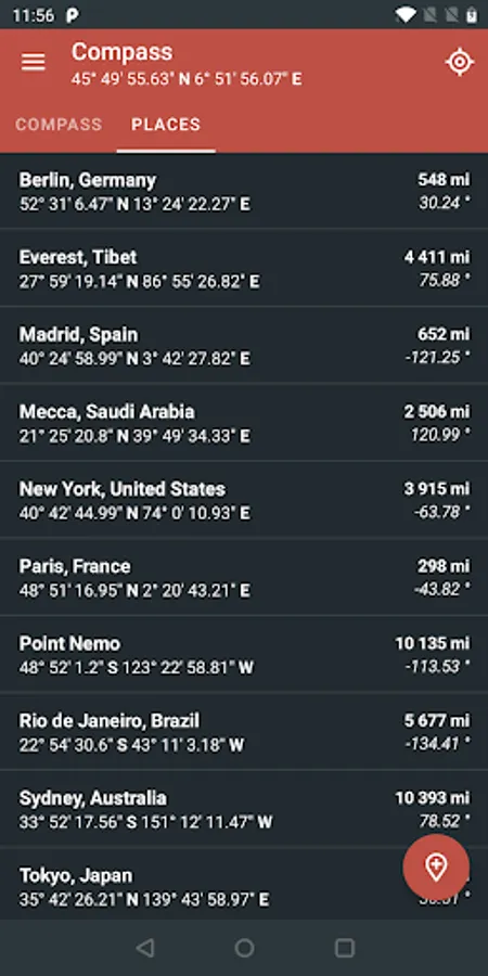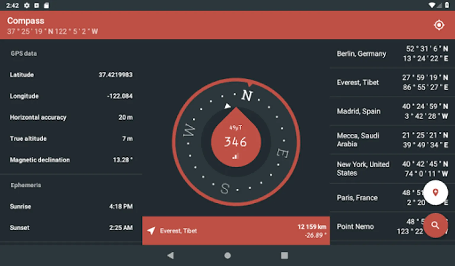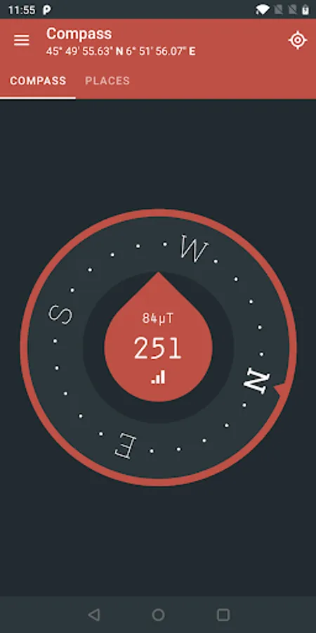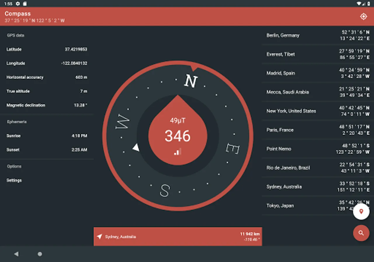 A magnetic compass with magnetic declination correction for best accuracy. A compass is an instrument used for navigation and orientation that shows direction relative to the geographic North. Geographic North is computed given the magnetic North and the magnetic declination at your current location. In some places around the world, the magnetic North can be as far as 20 degrees from the geographic North.