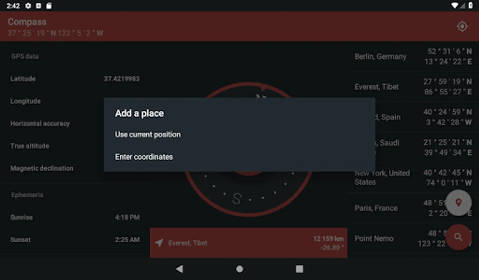 This application requires permissions in order to compute your location and the magnetic declination for a better accuracy of this compass and to provide you with further information such as true north, true altitude above sea level, direction and distance to any place in the world.