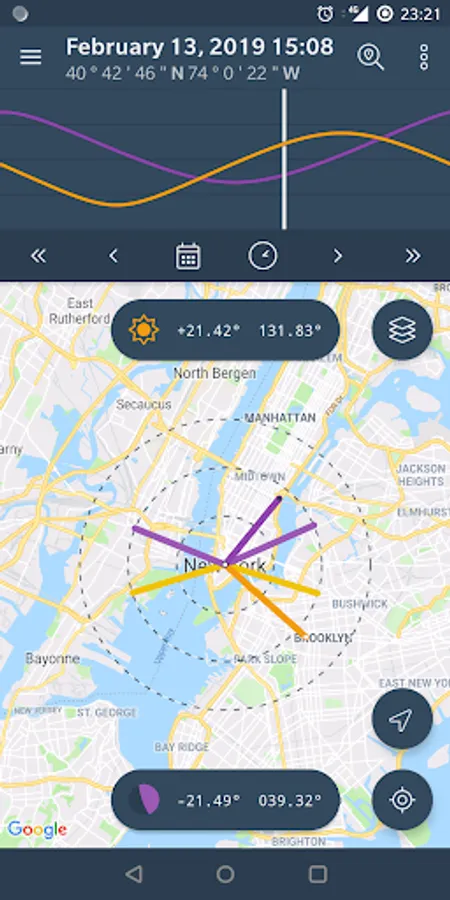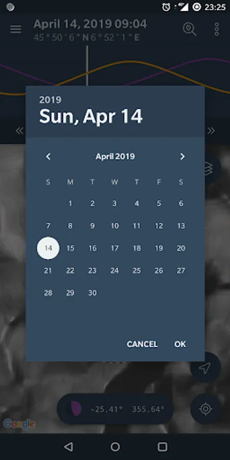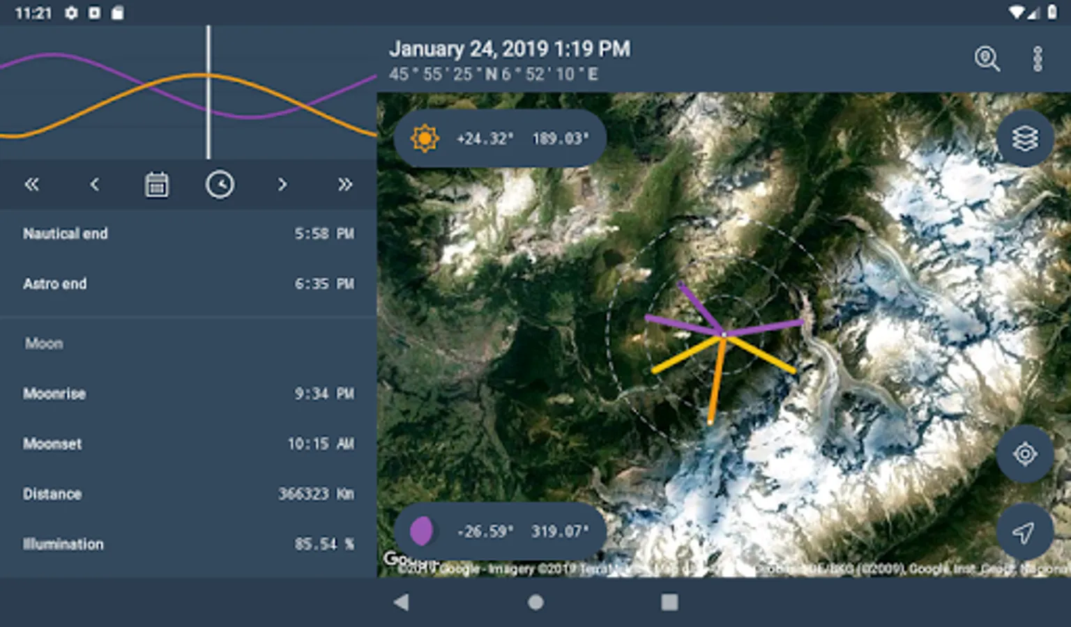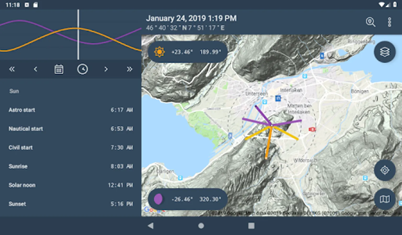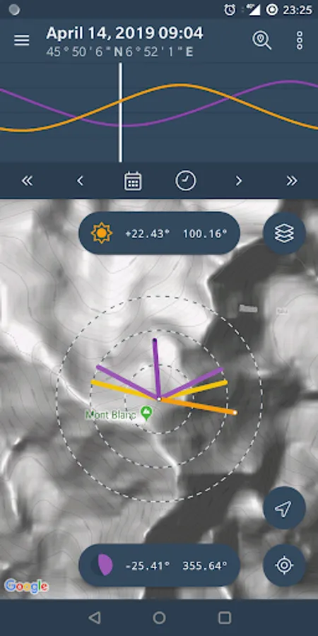 Use the calendar controls to change the date and time. You can jump from one day to another or from one week to another or use the date time picker to select the date you want. Then you can use the elevation graph to adjust the time within the day. At any time, you can rewind/forward to the current date time which will activate live mode (which follows your phone's clock).