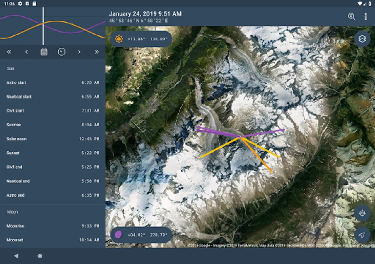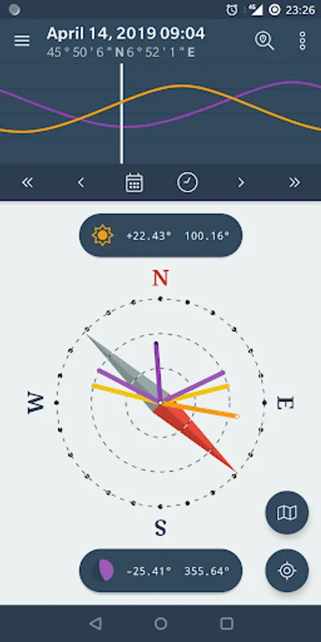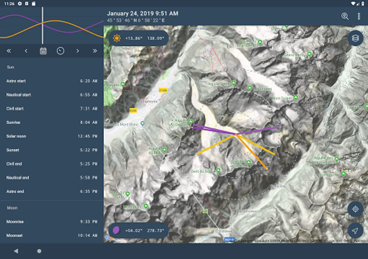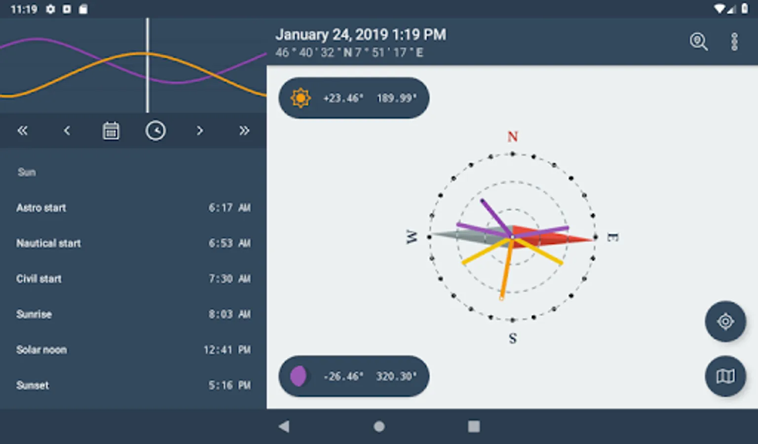 An ephemeris gives the positions of naturally occurring astronomical objects in the sky at a given time for a given position. The Sun Ephemeris gives you the accurate position of the sun and the moon at any time for any location on earth. The Sun Ephemeris is ideal for landscape, nature, travel and outdoor photographers. It combined a map-based approach to search for any place on the planet with a compass based approach to easily find the direction of the sunset, sunrise, moonset or moonrise.