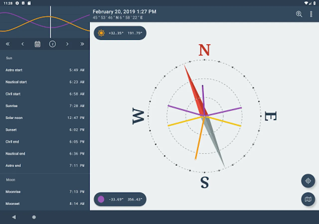 Use the Compass view to get the direction to Sunrise, Sunset, Moonrise or Moonset for the selected location and date.
