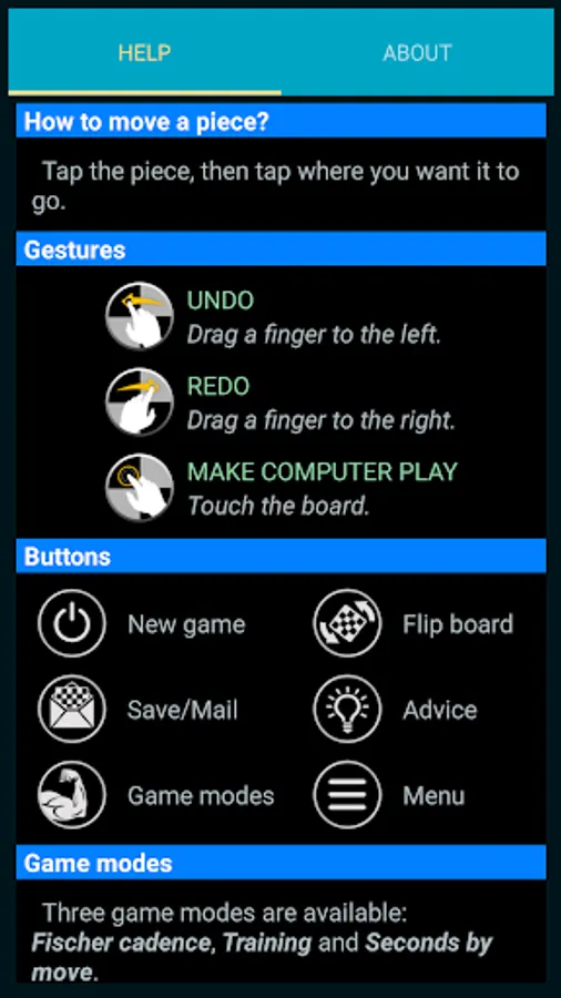 * 3 Game modes: Fischer Cadence (Blitz games are possible !), Seconds By move and Trainings