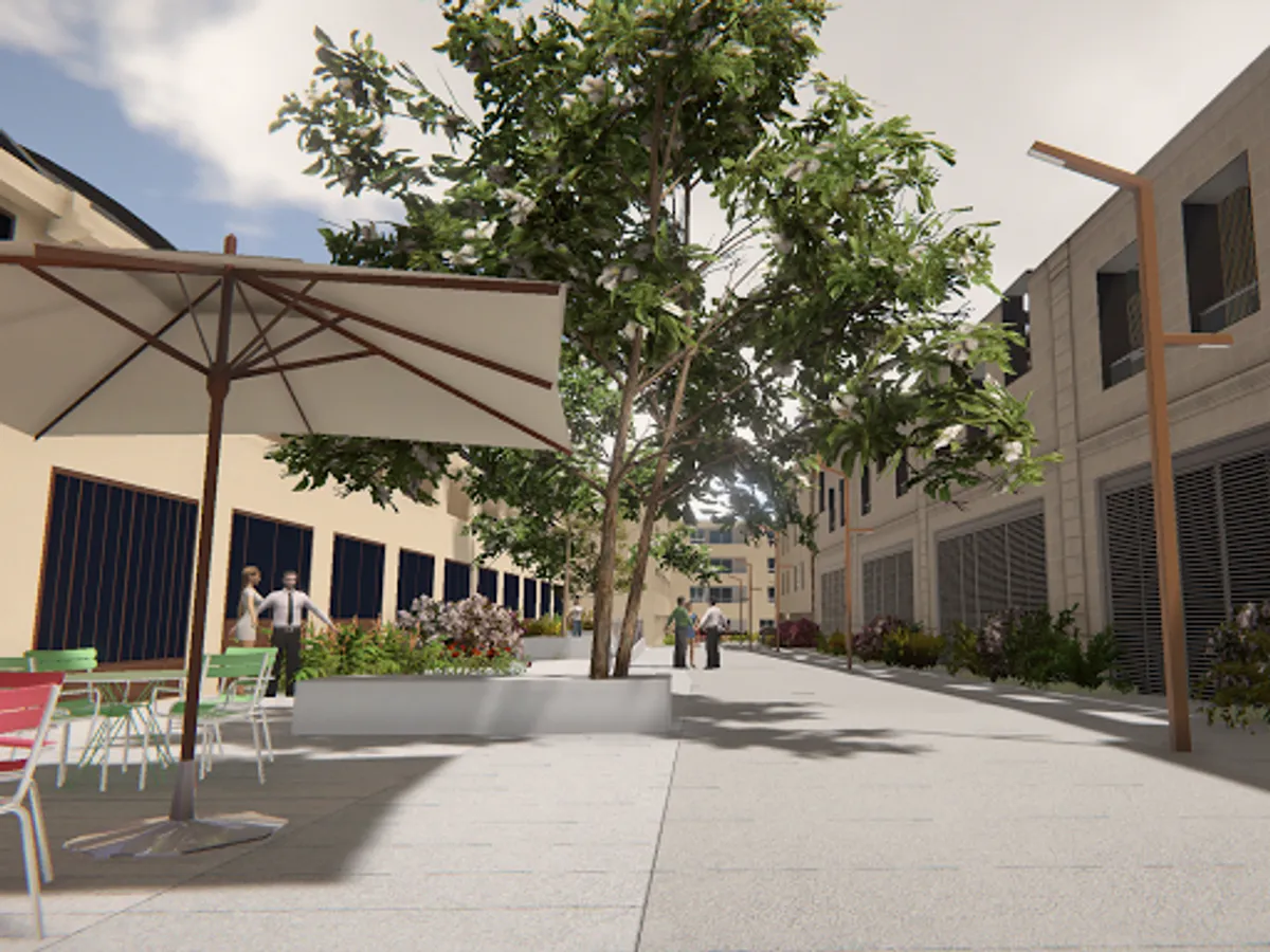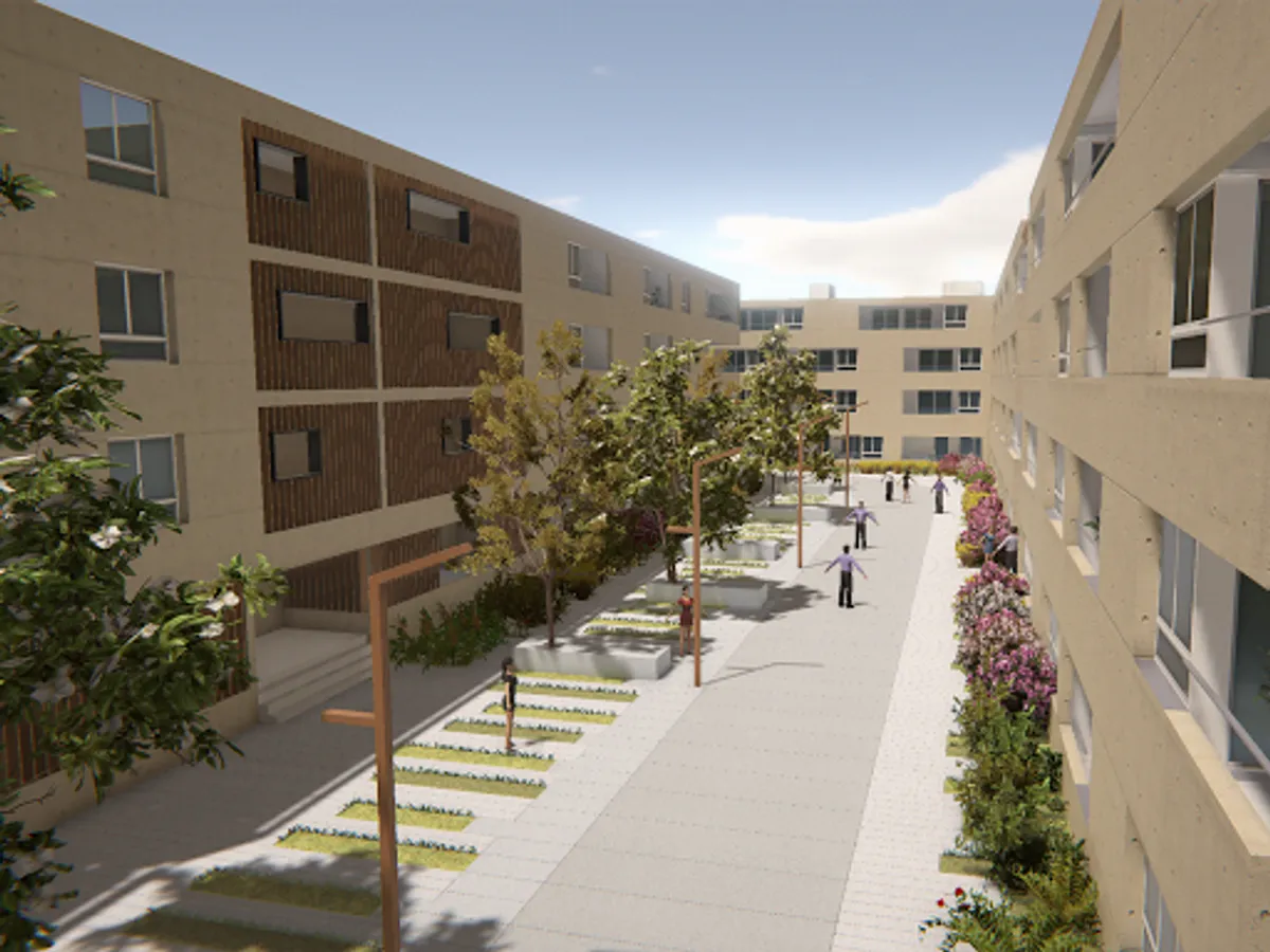 Along a wide alley dedicated to motorized transport, and a green mineral staging takes shape in alternating paved paths, wooden decks, chic and Zen gardens.