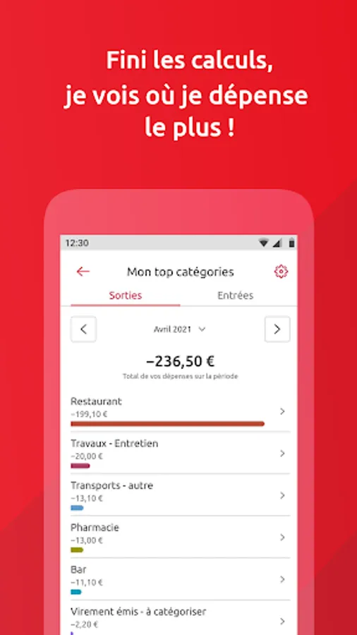 Optimize the management of your budget. With the "categorization of transactions", "top expense categories", "cash inflows and outflows", you can more easily spot your account movements and the most expensive budget items.