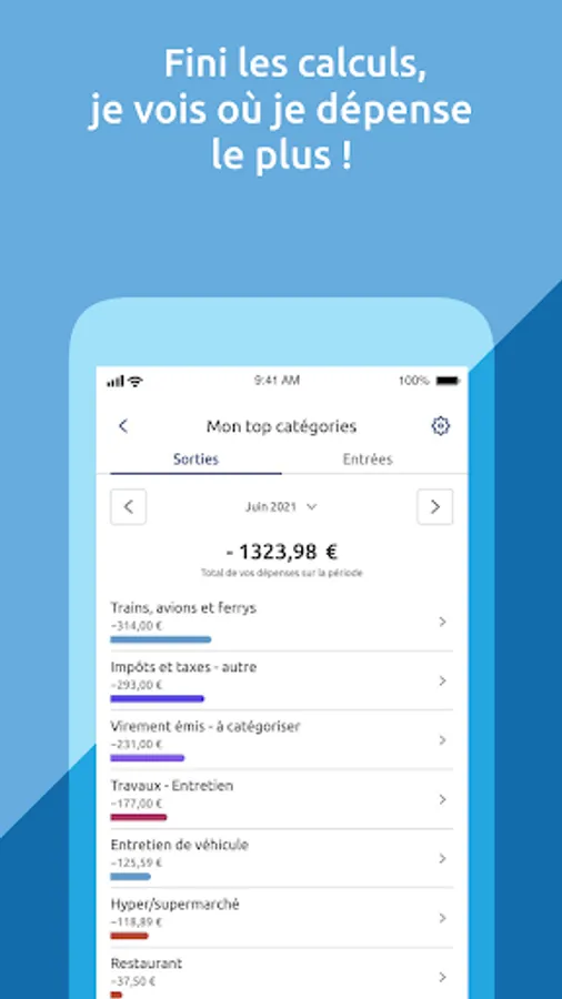 Optimize the management of your budget. With the "categorization of transactions", "the top categories of expenses", "inflows and outflows of money", you can more easily identify the movements of your account and the most expensive budget items.