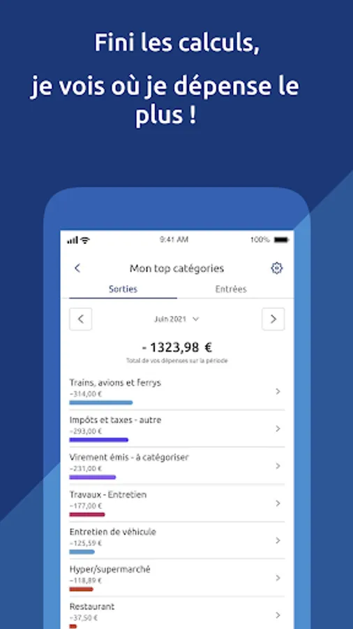 Optimize the management of your budget. With the "categorization of transactions", "the top categories of expenses", "inflows and outflows of money", you can more easily identify the movements of your account and the most expensive budget items.