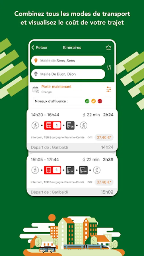 Departure times, lines, stops, journey times, arrival times, connections, pedestrian routes between stops and your origin or destination, Mobigo gives you access to all this information. Thanks to the memorization of your favourite stops, Mobigo facilitates your daily timetable searches. You can quickly find the next departure time for your line or at your stop, using the timetable search. You can also find all the timetables for the day or date of your choice. Finally, check the status of transport services on your networks and lines in real time and have access to information adjusted during your journey. The Mobigo application also shows you the cost of your journey, whatever your origin and destination, on all the partner networks in Burgundy-Franche-Comté, as well as the amount of monthly and annual subscriptions if they exist.