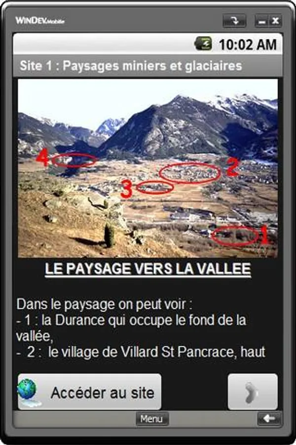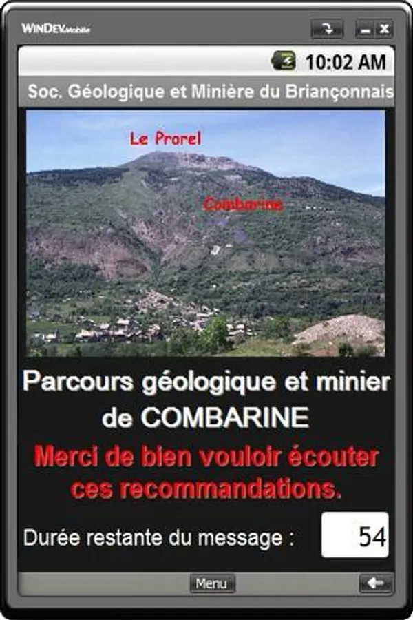 This application is designed to allow amateur geologists discovered, independently, the geological wealth of a former mining area of Briançon (Hautes Alpes), the sector Combarine. It was conducted by an association, the Geological and Mining Company of Briançon in collaboration with a company, Briançon IT Services.