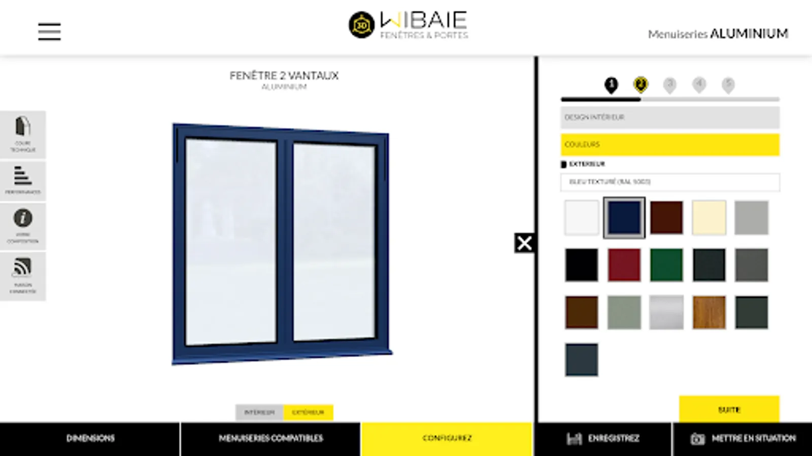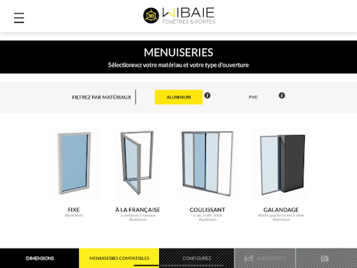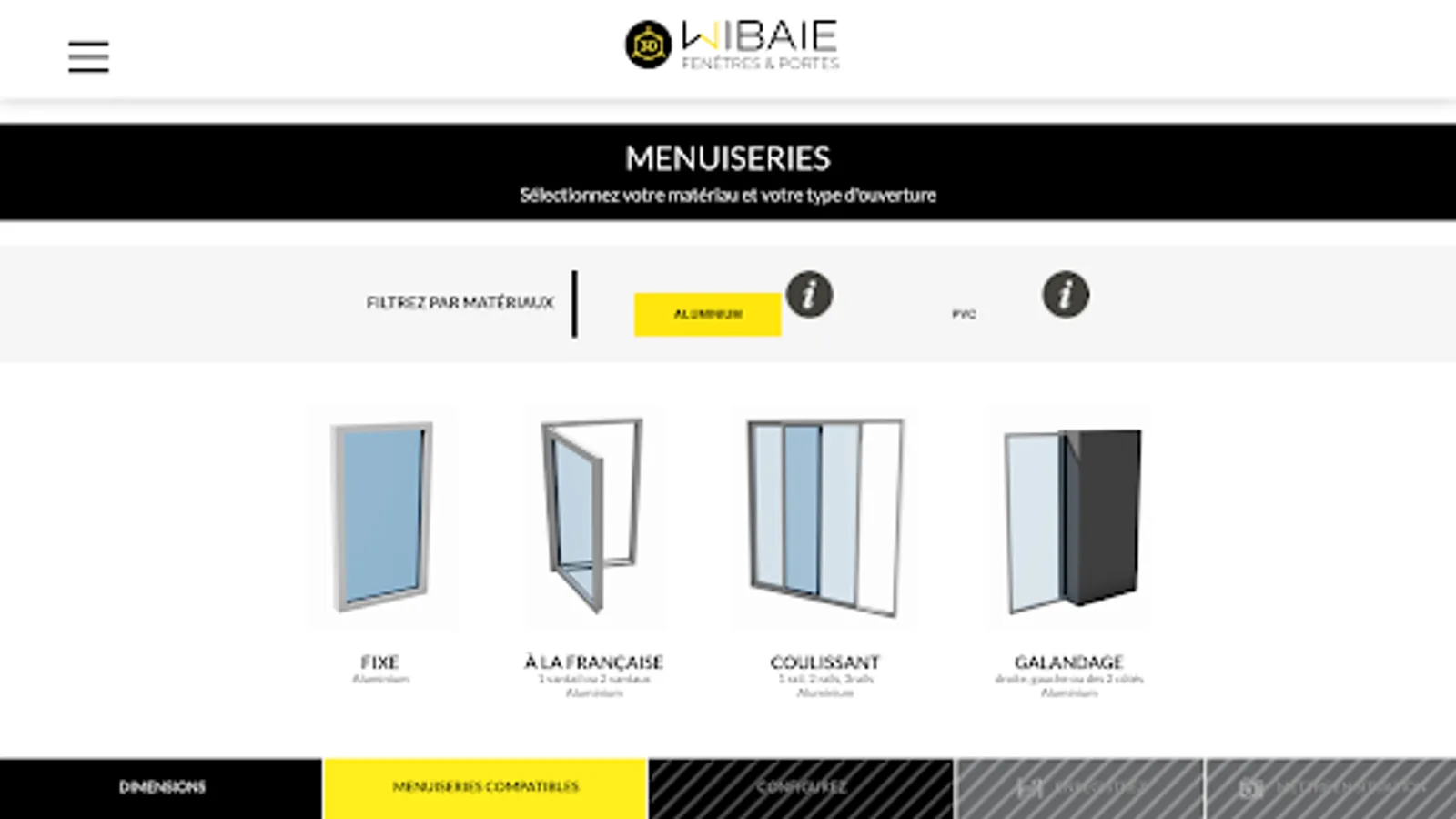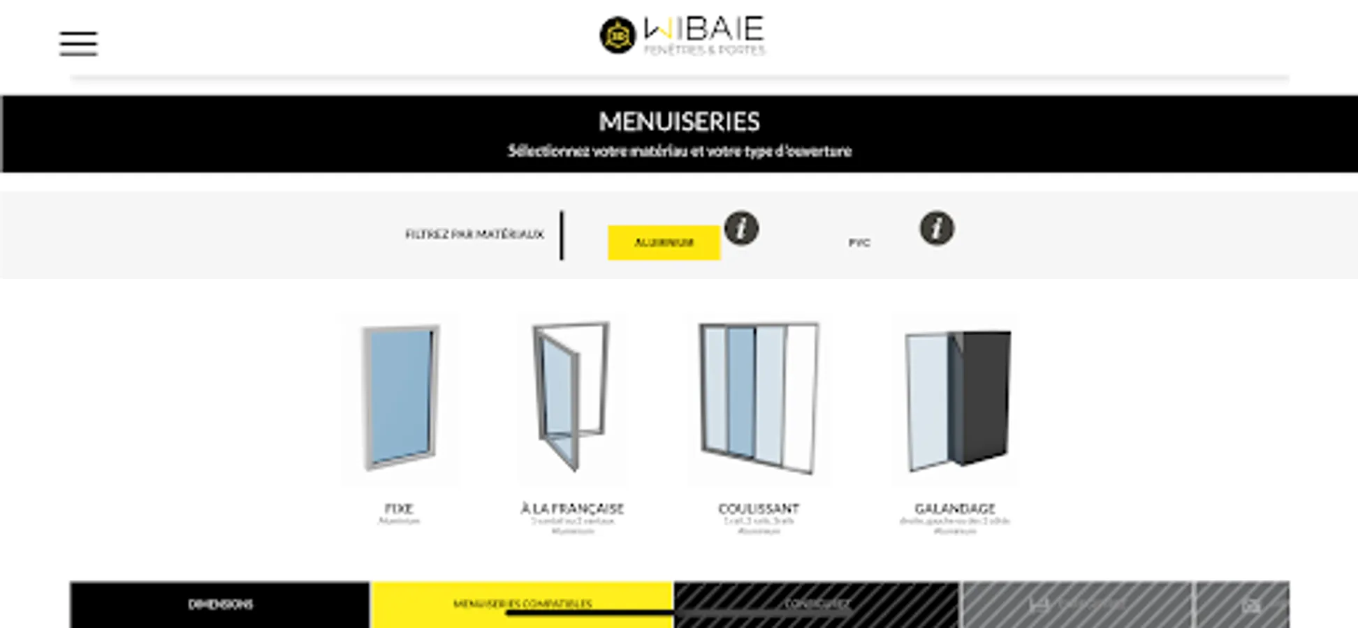 Choice of material, size, type of opening, design, color, handle, glazing, glazing, rolling shutter... this application allows you to configure and visualize your joinery in 3D.