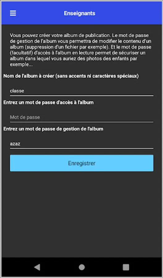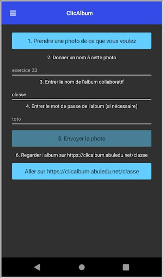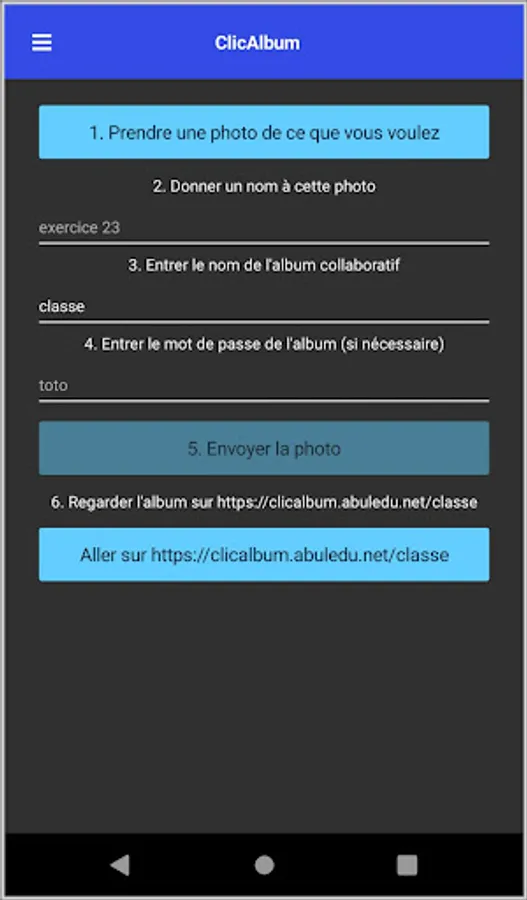 This application allows a teacher to create a photo album which will then be added to by children from a smartphone (from their parent).