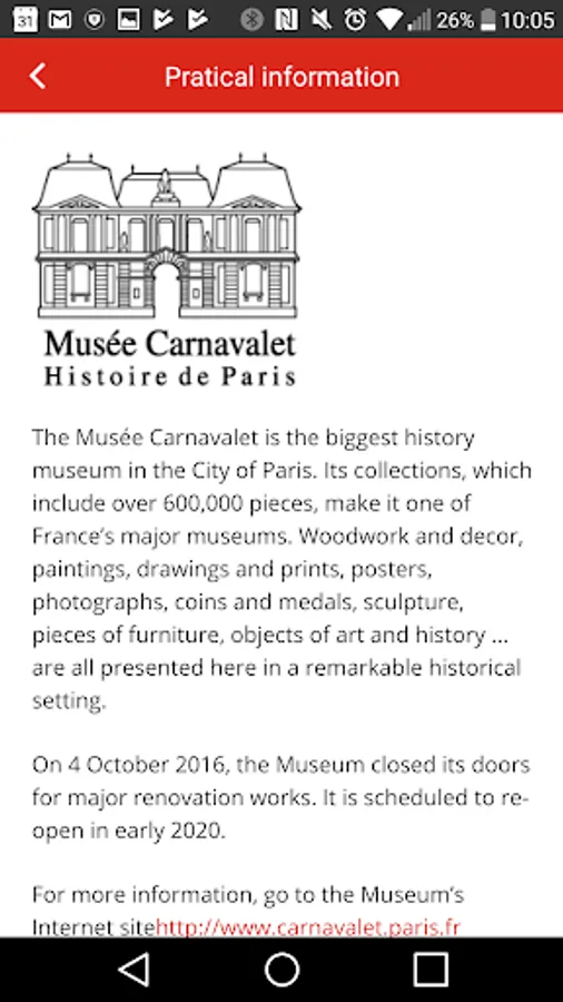 The Musée Carnavalet is the biggest history museum in the City of Paris. On 4 October 2016, the Museum closed its doors for major renovation works. It is scheduled to re-open in early 2020.
