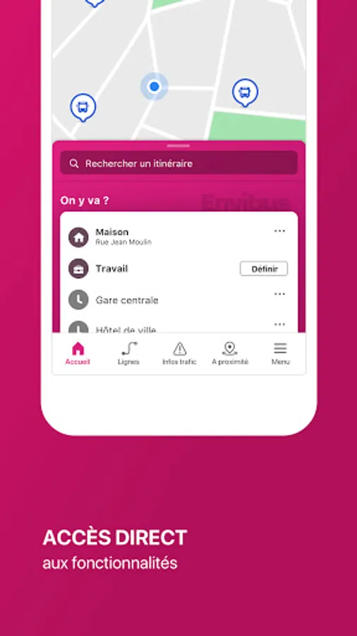 ENVIBUS CAP AZUR also lets you geolocate to identify the nearest bus stop and calculate the route of your choice. The application also integrates the traffic alerts of the three bus networks (Envibus, Palmbus and Sillages) as well as their next passages in real time.
