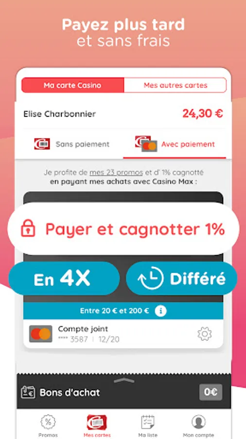 Save time and avoid waiting at the checkout by paying with your smartphone, and find all your advantages and services in the app: exclusive promotions, discount coupons, loyalty cards, kitty, receipts, catalogs, budget tracking shopping, shopping lists, Casino Max subscription... An ALL-IN-ONE app that simplifies your in-store shopping.