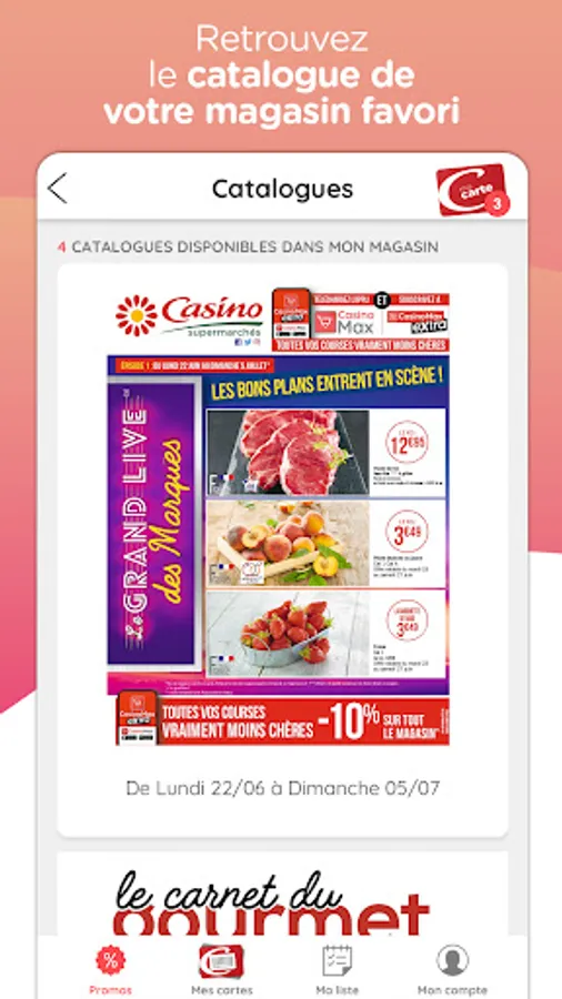 Find all the catalogs available at Casino#hyperFrais and Casino Supermarket, and in your favorite store. At home or at the office, browse the catalogs of your favorite store from your Casino Max app.