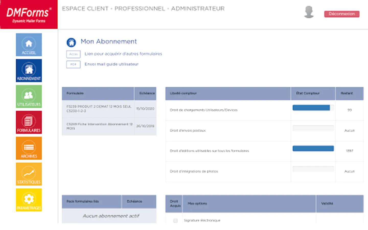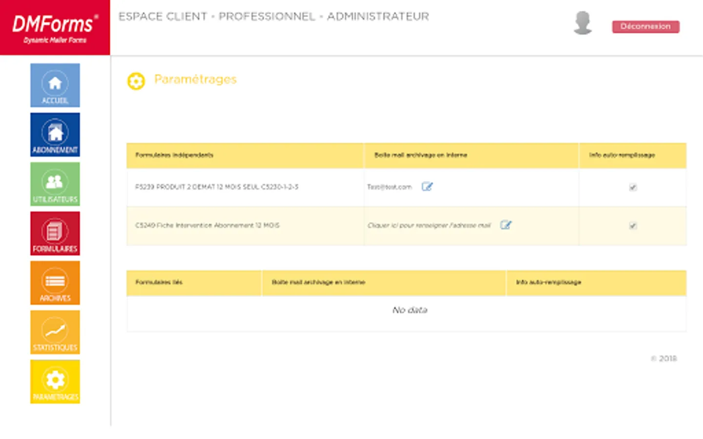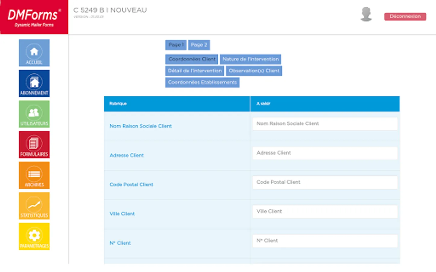 The DMFORMS application allows for the professional, the use of dynamic forms standard or specific to his organization (work intervention certificate, legal certificate, equipment loan, purchase order, delivery, invoice ...), which can be filled at any place regardless of internet connections, keep and use their data for several years for the automatic filling of other forms or for the export of this data to marketing or internal accounting.