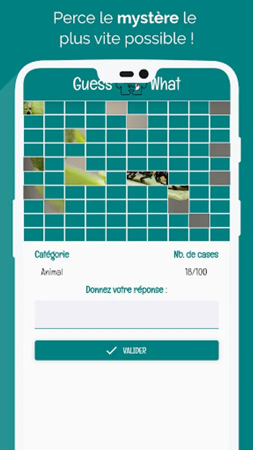The game Guess What is very simple. Every day, all the players compete on the same picture. They must try to determine what is hidden under the squares, according to the selected category (animal, object, place, celebrity …) as fast as they can. At 7 am, the game starts. Out of a hundred squares in total, seven are revealed. At 8 am, more squares are shown and so on until 8 pm. Each player can try their luck once an hour, as long as they haven’t cracked the mystery. A correct answer given between 7 am and 8 am is worth 500 points. The same answer given an hour later is worth 400 points, and so on. Points add up day after day.