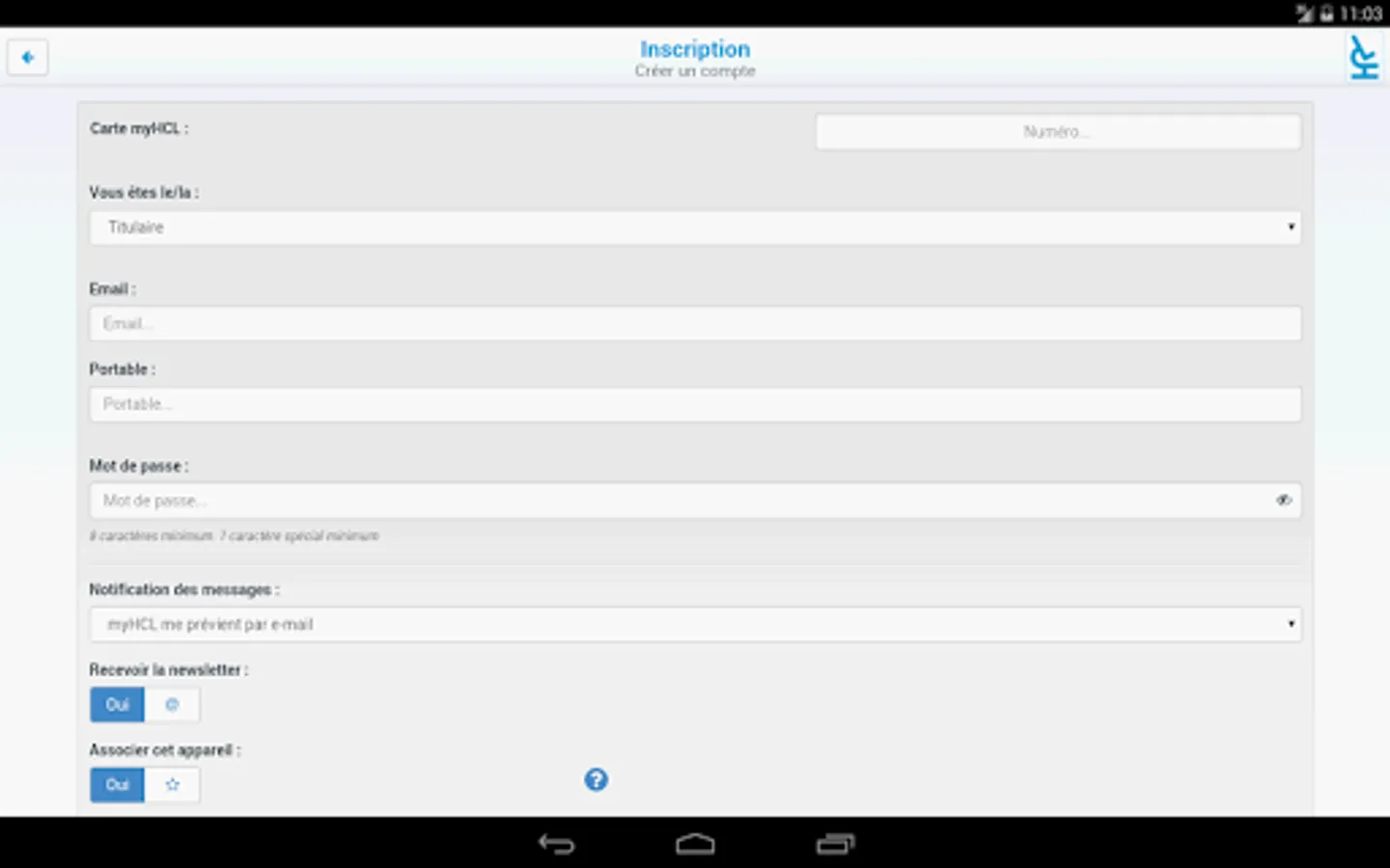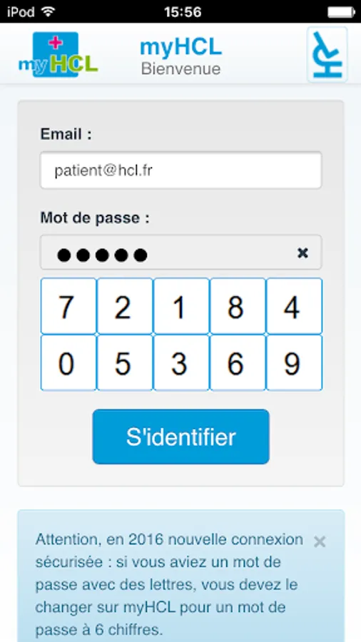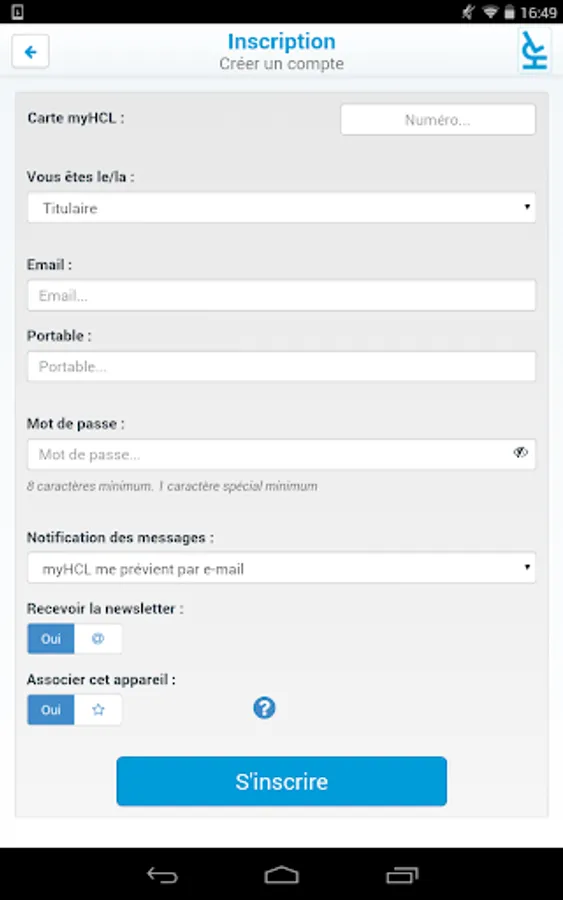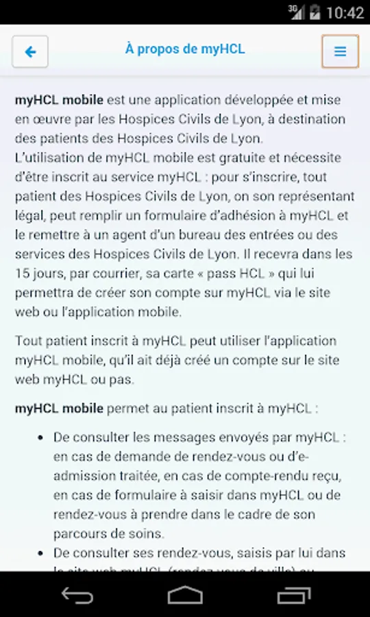 The use of mobile myHCL is free and requires to be registered for the service myHCL: to register, any patient Hospices Civils de Lyon, is the legal representative can complete an application form and submit it to myHCL a agent office entrances or services of the Hospices Civils de Lyon. He will receive within 15 days, by mail, his "HCL pass" card that will allow him to create his account on myHCL via the website or mobile application.
