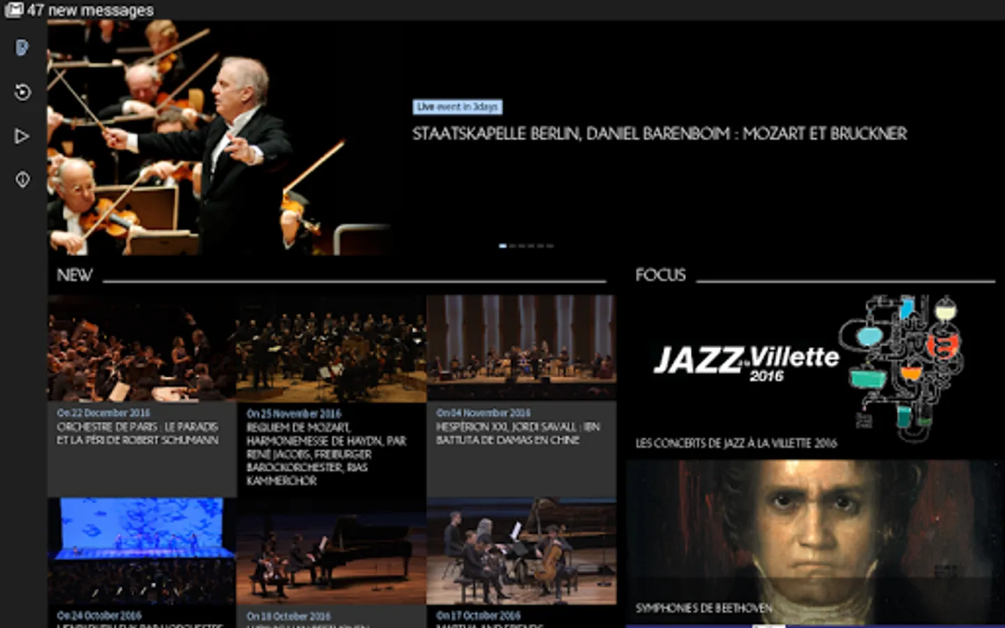 concert, direct, live, video, replay, recording, classical, baroque, opera, orchestra, piano, violin, beethoven, mozart, vilvaldi, wagner, malher, stravinsky, jazz, festival, cité de la musique, villette, France musique, medici, mezzo, arte, days off, boulez, contemporary, recitals