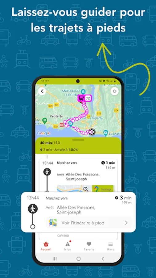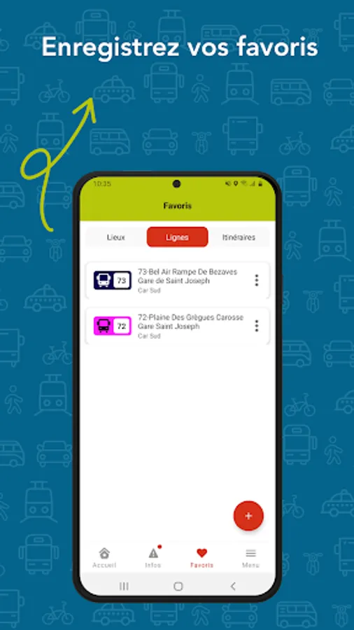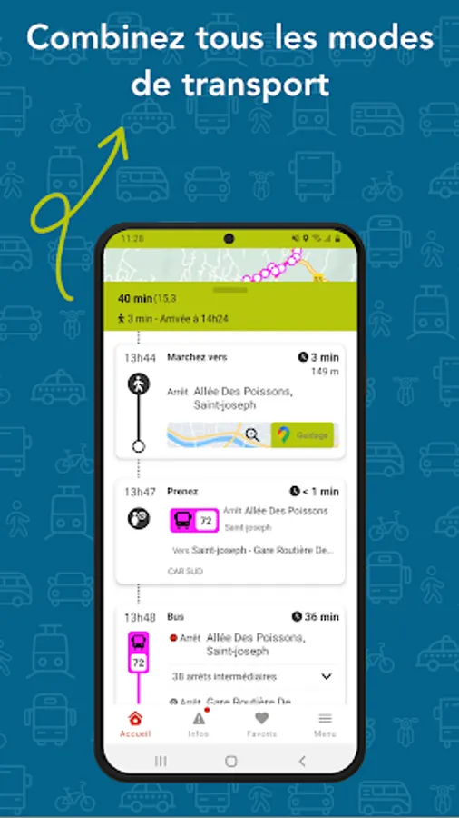 - Personalized itinerary: Enter your starting point and your destination: the application will offer you the most effective multimodal solutions with a step-by-step description of your journey.