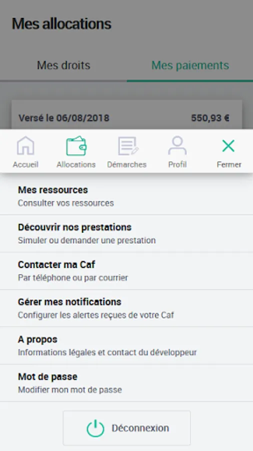 The app asks you for permission to access your photos/media/files to allow you to attach supporting documents when needed and your Wi-Fi network status to check your connection in case of an error of the app. La Caf remains very concerned about the security and respect of your personal data. To log in, you must use your social security number and your personal (alphanumeric) password. After your first connection, you can also connect via biometrics (fingerprint and/or face recognition) or the FranceConnect device.