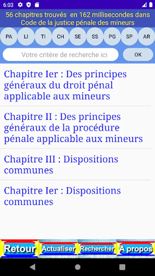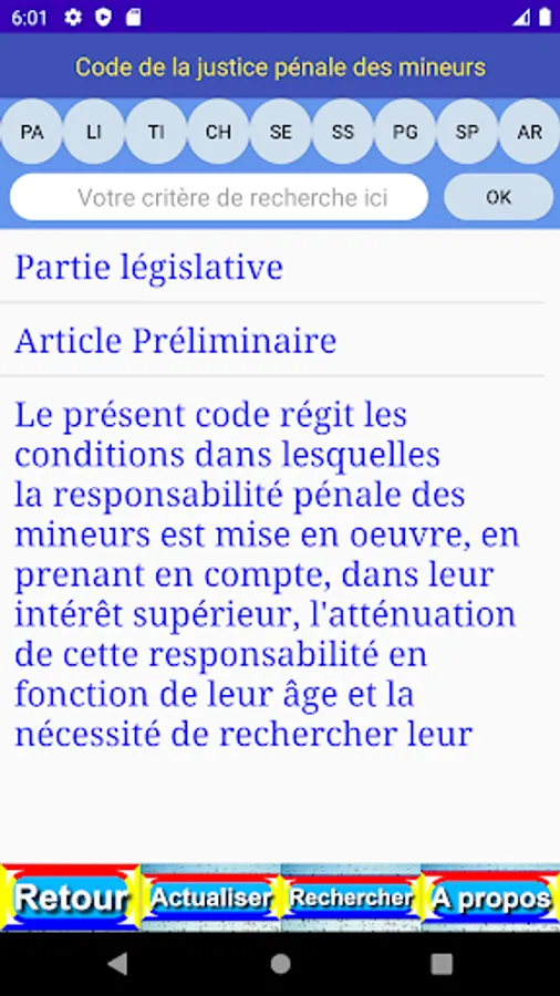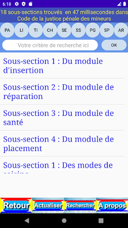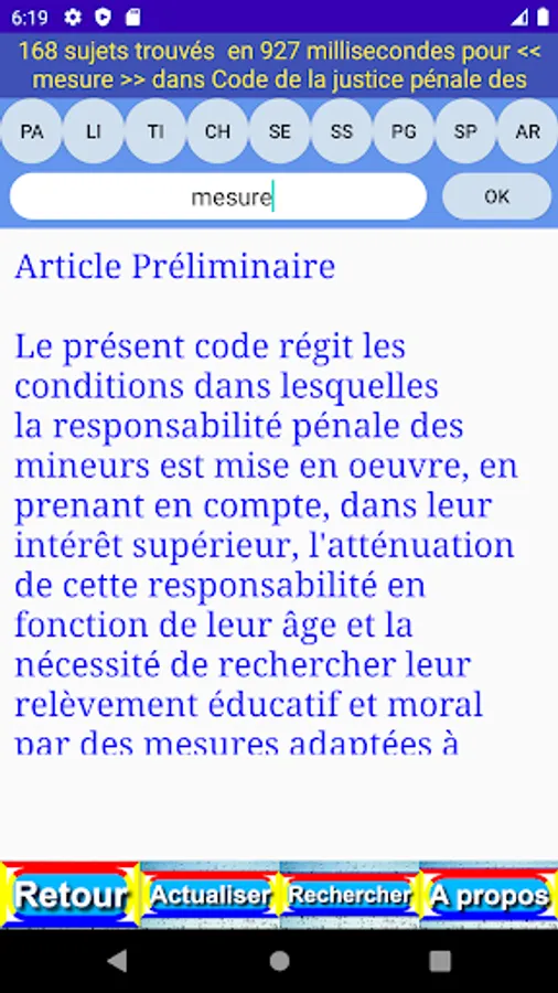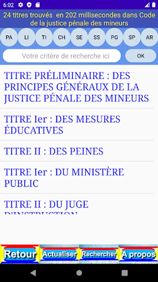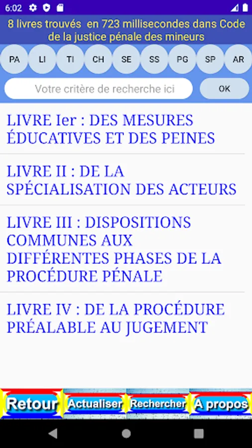 The criterion entered is easily found in the different levels (book (LI), part (PA), title (TI), chapter (CH), section (SE), paragraph (PG), point (PO), article (AR) and content (OK)) of the publication.