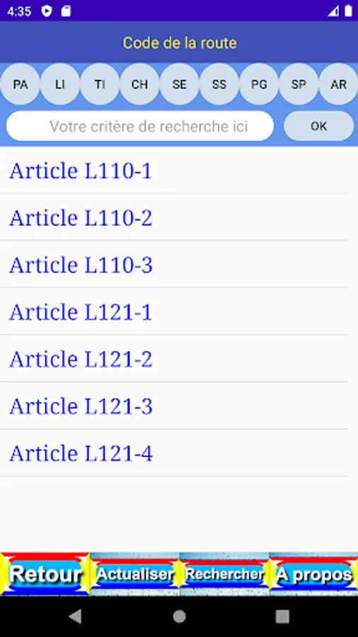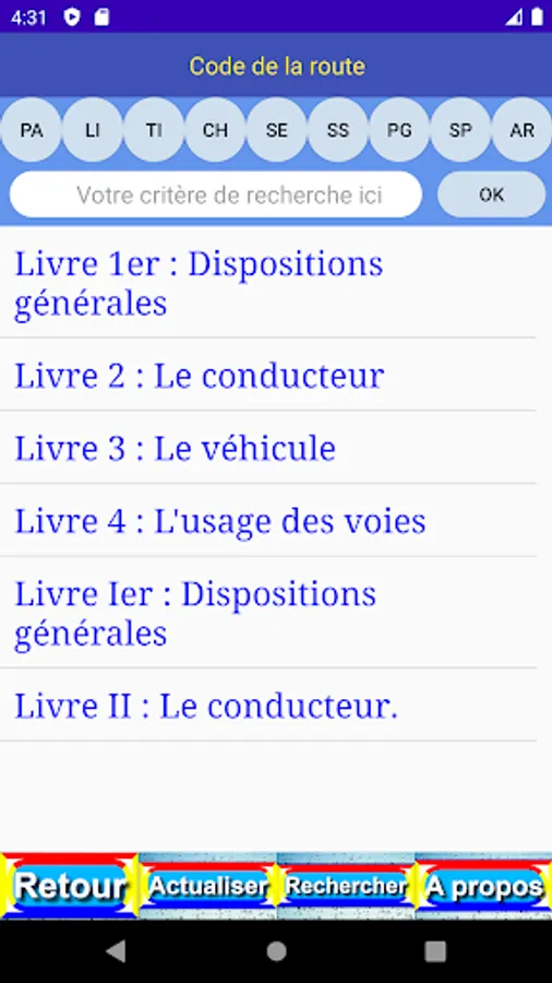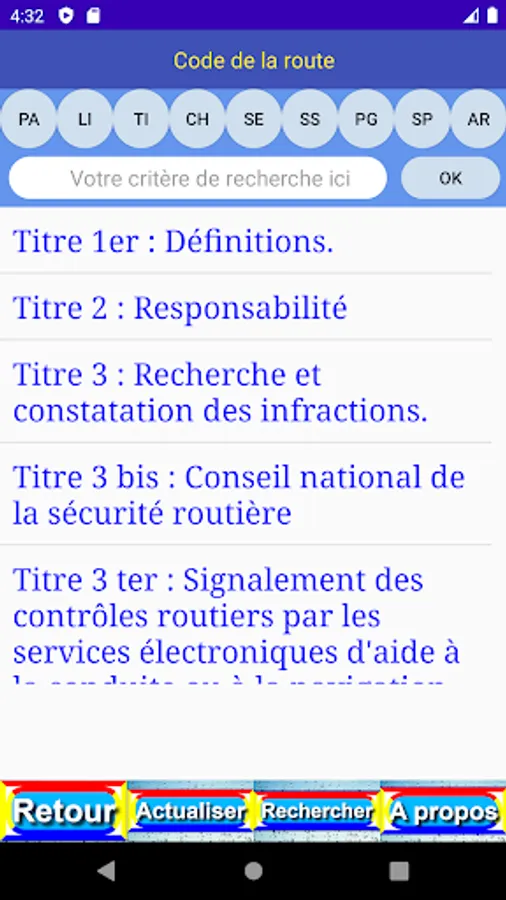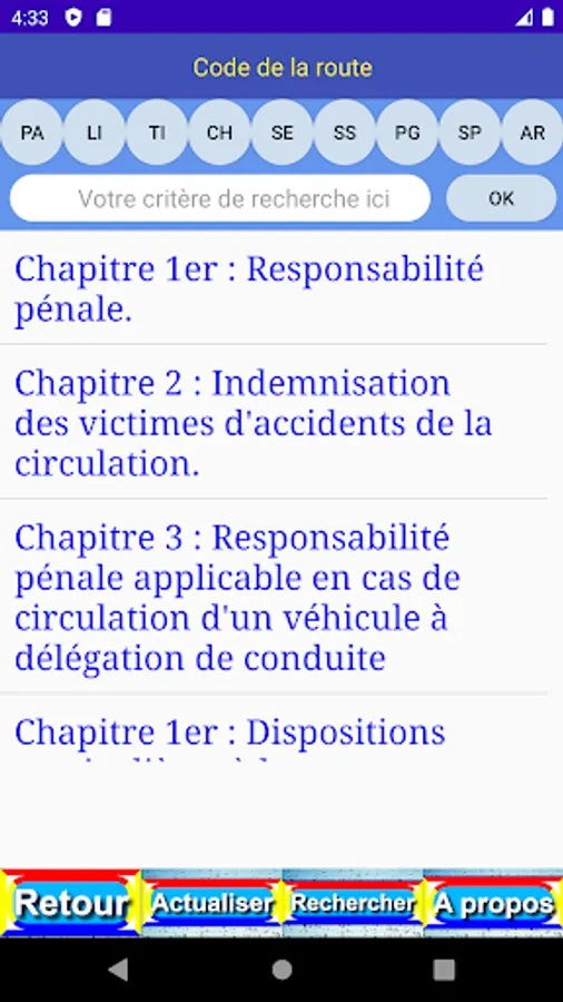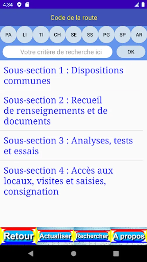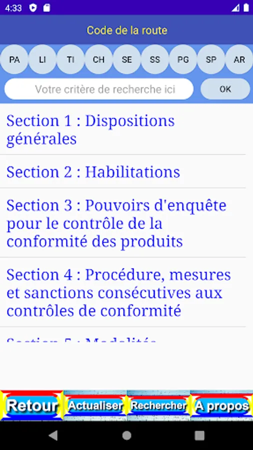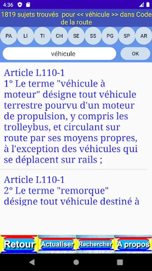 The criterion entered is easily found in the different levels (book (LI), part (PA), title (TI), chapter (CH), section (SE), paragraph (PG), point (PO), article (AR) and content (OK)) of the publication.
