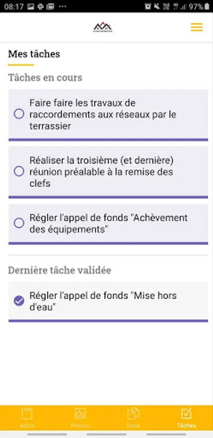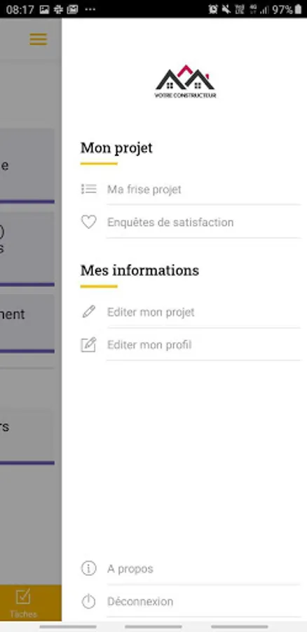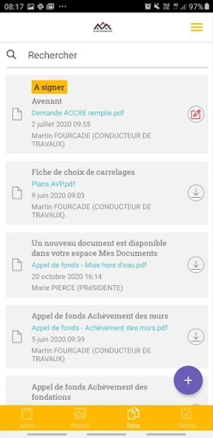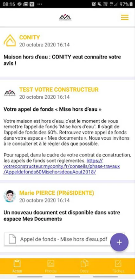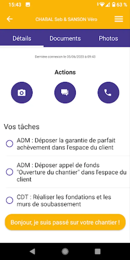 With our application, builders can follow all of their projects, validate tasks to move each project forward, easily deposit site photographs in their clients' spaces, send personalized messages to their clients, archive and consult their documents. (plans, contracts, descriptive notices, etc.), improve their communication, save time on a daily basis.