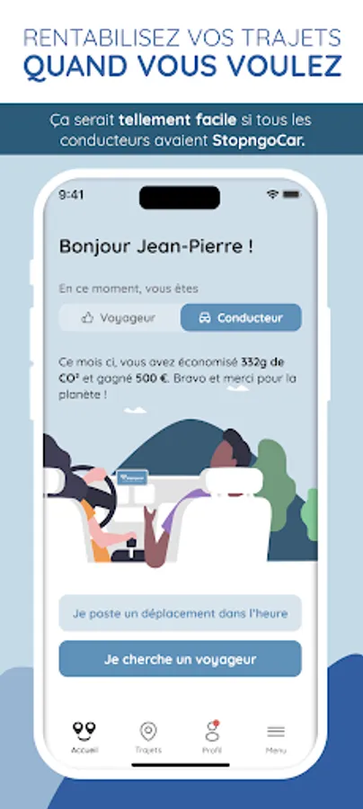 Stopngocar is a carpooling application allowing motorists to share car journeys with other people traveling in the same direction. Each pedestrian can thus meet a driver at any time who is moving in the same direction as him and share the journey. Stopngocar allows users to find carpools available nearby without prior planning. On a daily basis, go from point A to point B in a spontaneous, economical and ecological way. The application allows carpooling in real time and becomes an opportunity to act for oneself and for others.