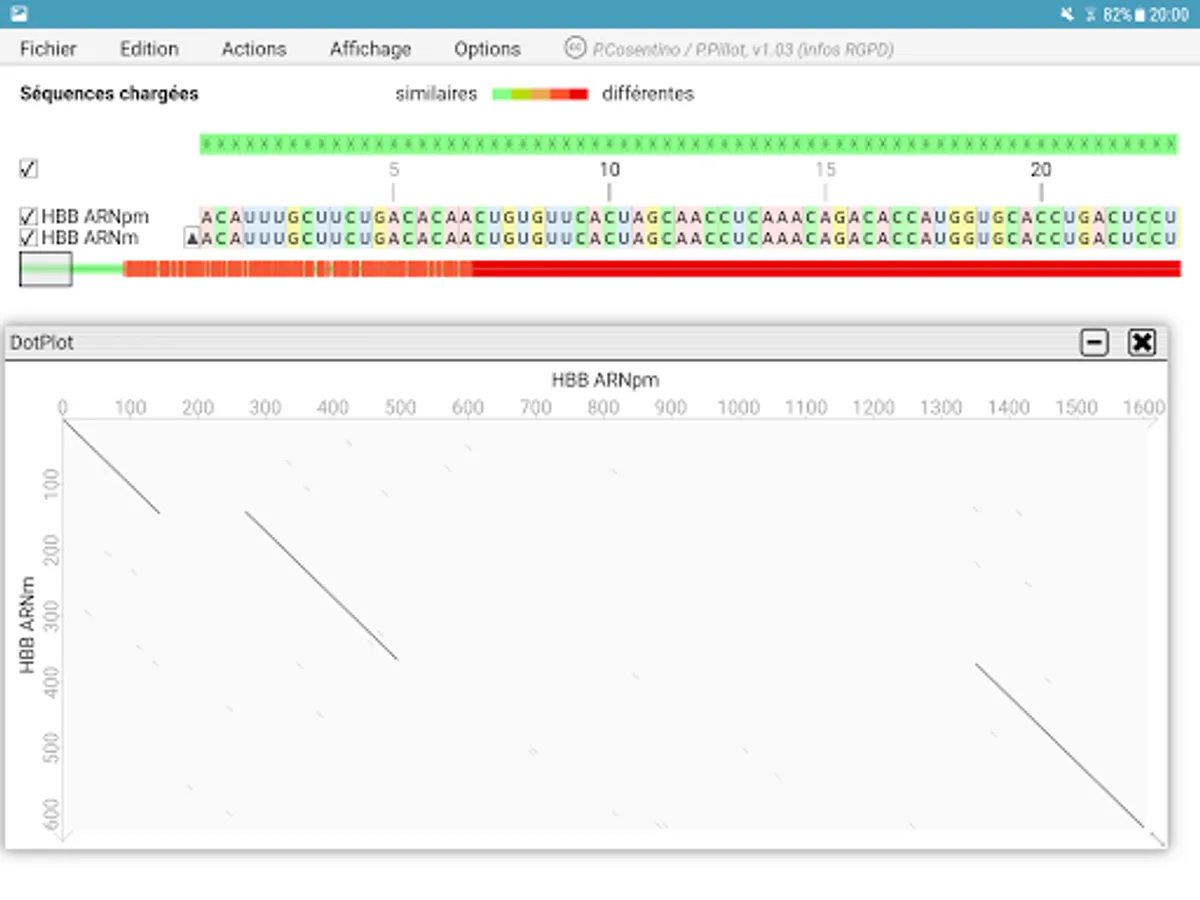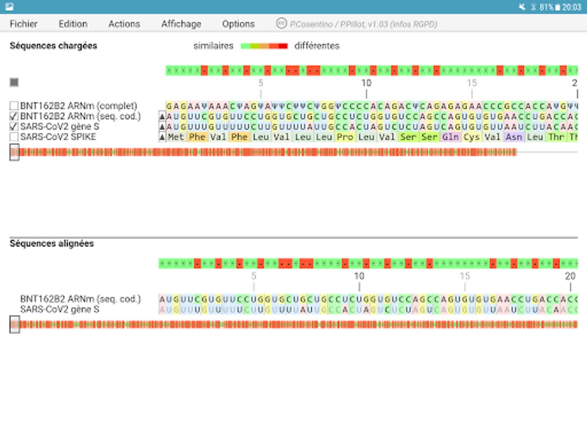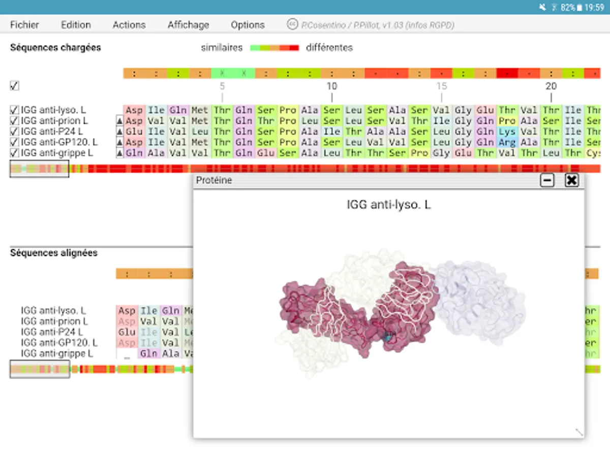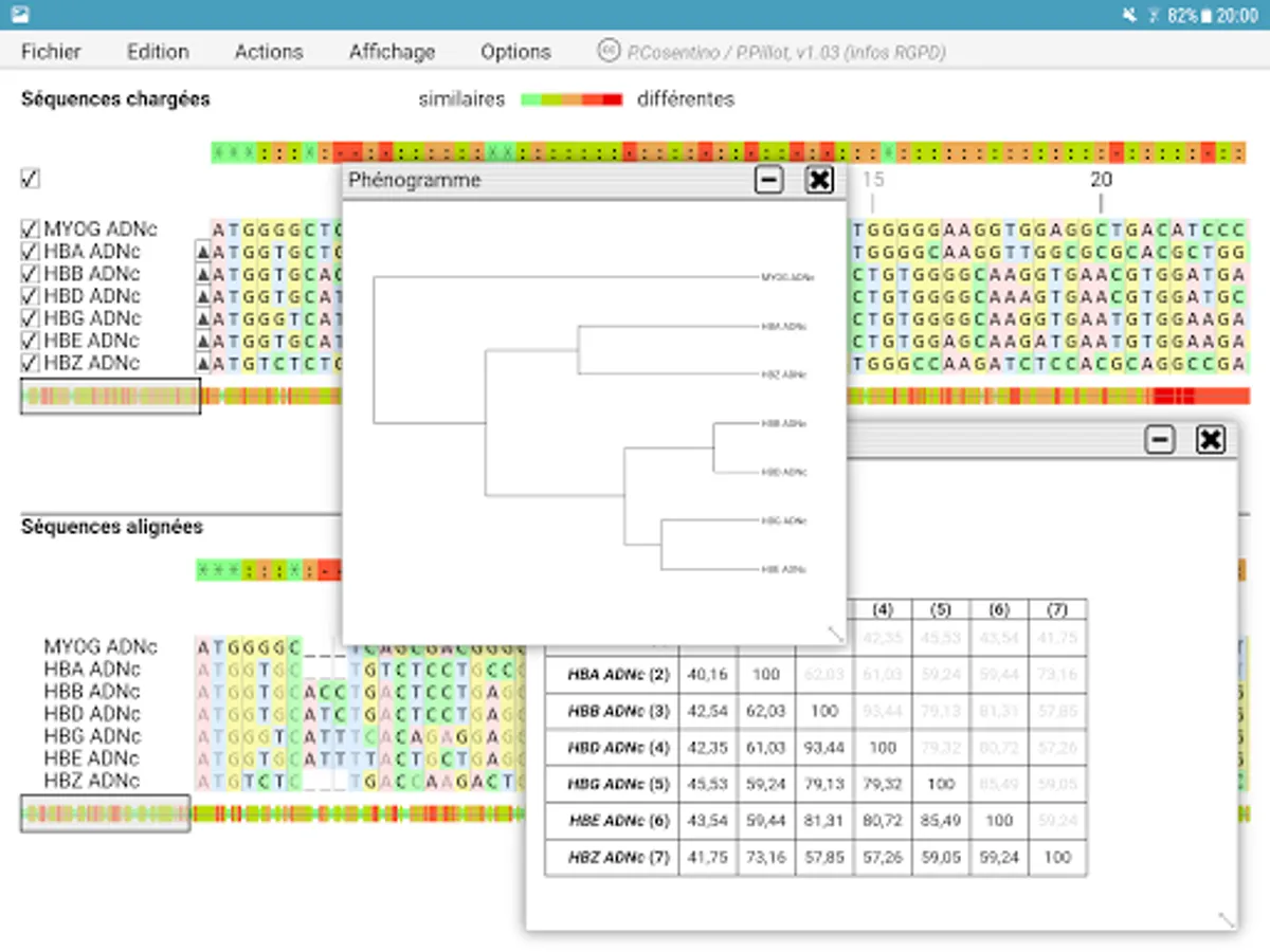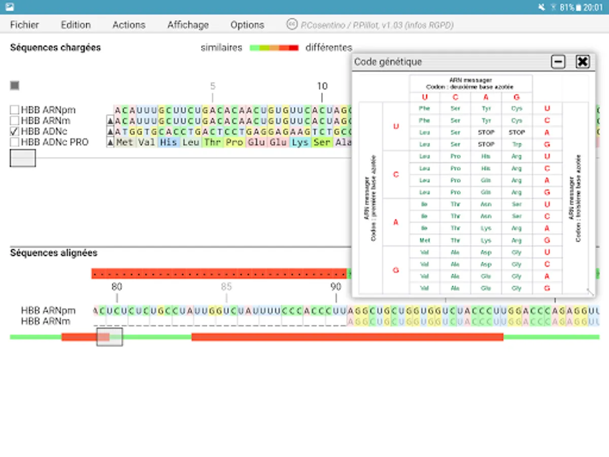 Geniegen2 is an application primarily intended for French-speaking high school students. With this application it is possible to align and then compare nucleotide or polypeptide sequences, but also to process them (transcription, translation etc.).