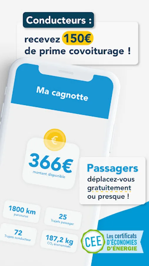 💰 With Covoit'ici, benefit from a carpooling bonus of 150€. €50 for the 1st journey with a passenger then €100 for the 10th journey with a passenger. Save money by giving a boost to passengers on your route.