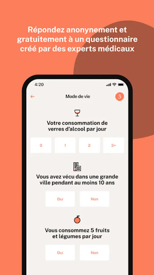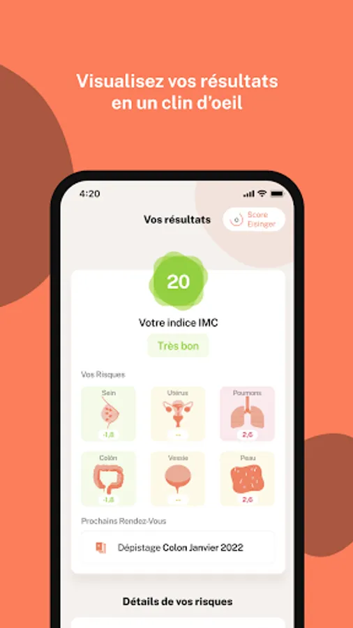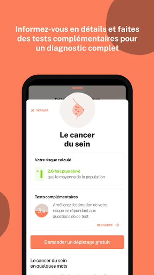 Depending on your age, gender, family history and an aggravated risk calculation (Pr. Eisinger's method), she directs you to screening, an oncogenetic consultation or to your attending physician. It allows you to assess your own risk of cancer.