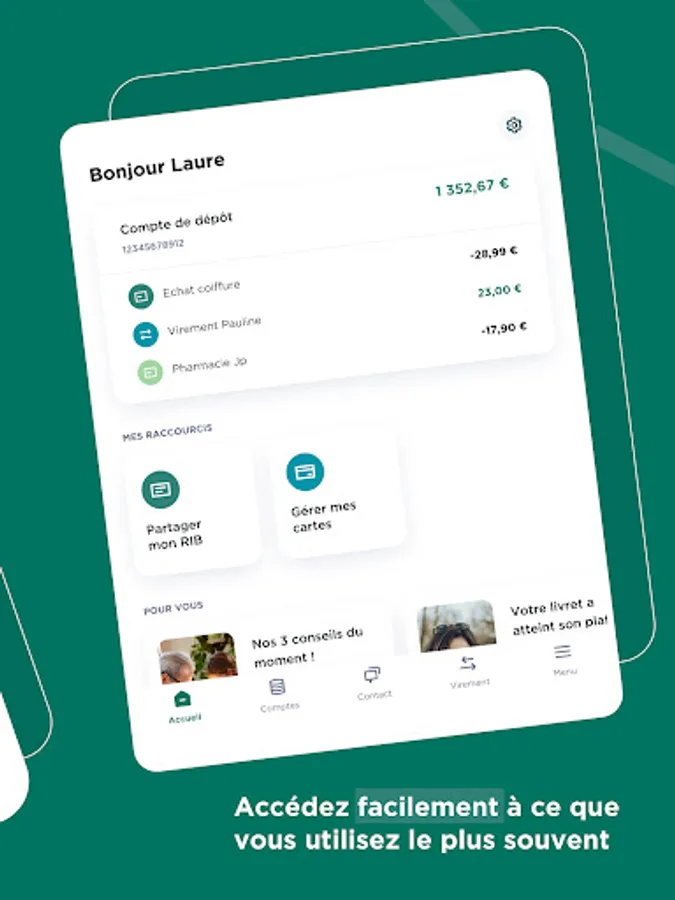 Elle vous accompagne dans la gestion quotidienne de vos comptes grâce à une navigation simple et fluide et un design clair et épuré.