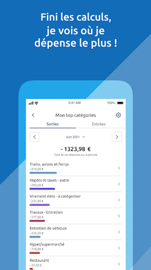 Optimize the management of your budget. With the "categorization of transactions", "the top categories of expenses", "inflows and outflows of money", you can more easily identify the movements of your account and the most expensive budget items.