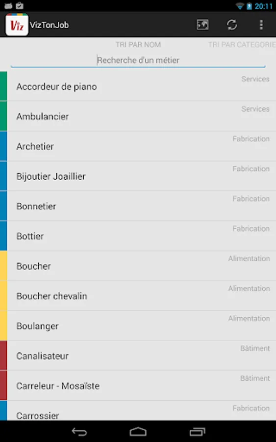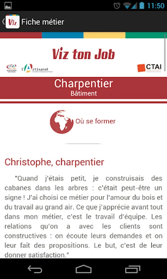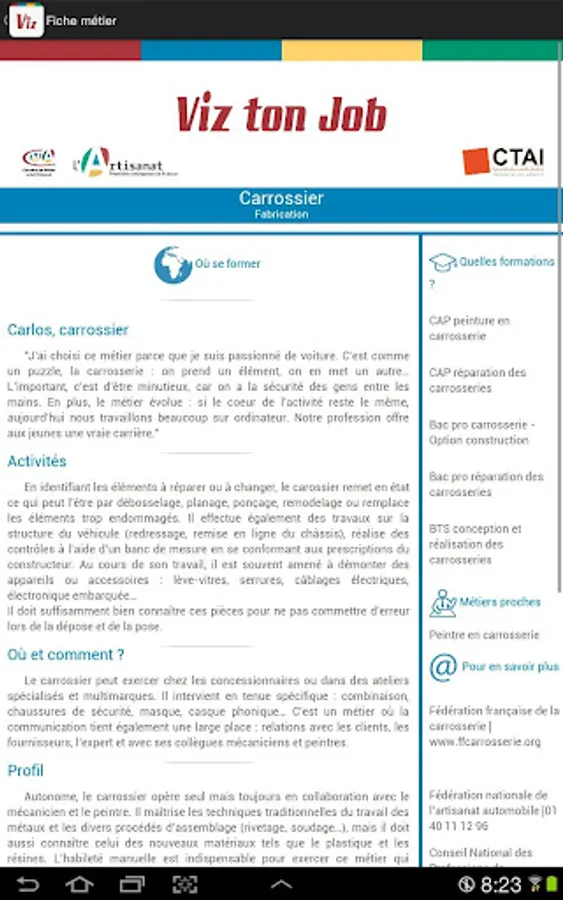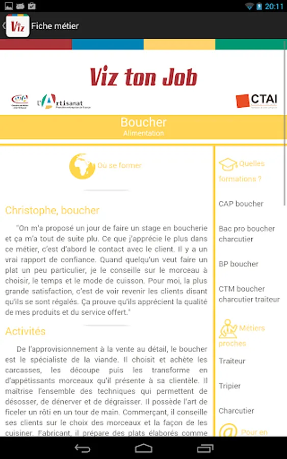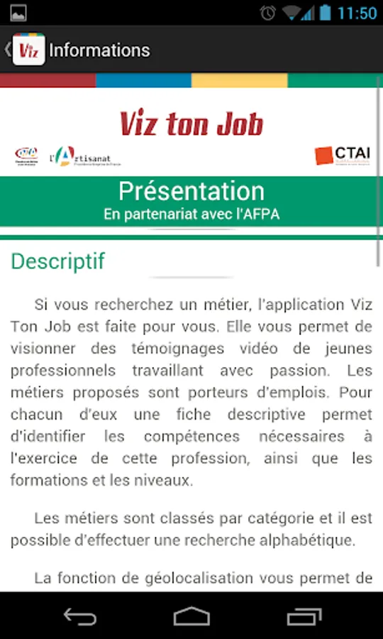 If you are looking for a job, this app is for you. Viz Your Job allows you to view the records of trades Handicrafts, see video testimonials of young professionals who work with passion. The listing identifies the skills required for this profession. These cards offer links to business portals to supplement the information. The application offers the sharing by email, Facebook and Twitter.
