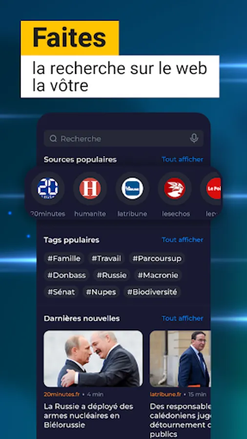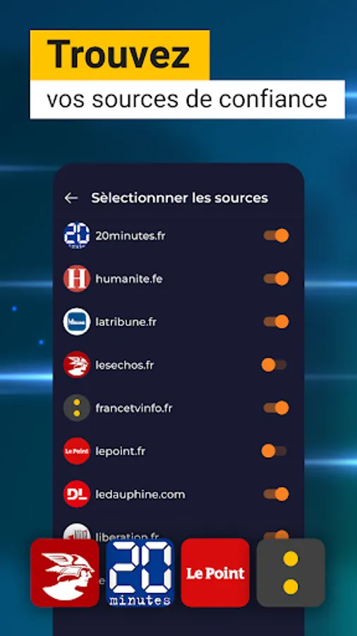 Comprehensive news coverage of the republic: We aggregate local news from the most reputable sites, news media such as Le Figaro, Le Monde, Liberation, Le Dauphiné, Le Point, FranceTV Info, Les Échos, La Tribune, L' Humanity and 20 Minutes. With our app, you can easily and quickly access relevant free news articles from these renowned sources.